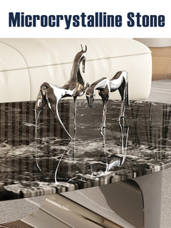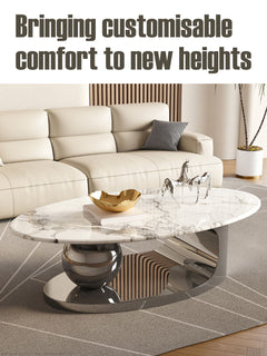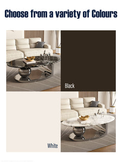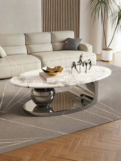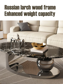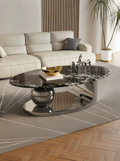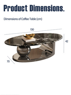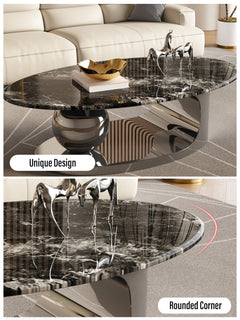 Elevate your living space with our exquisite marble coffee table, a statement piece that exudes luxury and modern design. This stunning oval table features a striking black marble top, complemented by a unique sculpted metal base with a captivating gold finish. The perfect center piece for any contemporary living room, this coffee table effortlessly combines artistry and functionality.