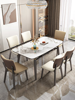 Modern Rectangular Dining Table Set with Marble Top and Upholstered Chairs. Elevate your dining room with this stylish and functional dining table set. The rectangular table features a beautiful marble top that adds a touch of luxury to any space. The matching upholstered chairs provide comfortable seating for your guests. Perfect for modern homes and apartments.
