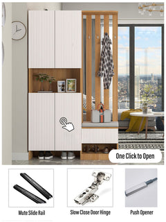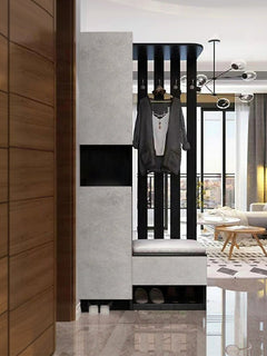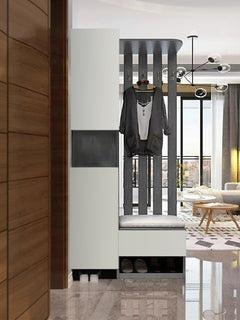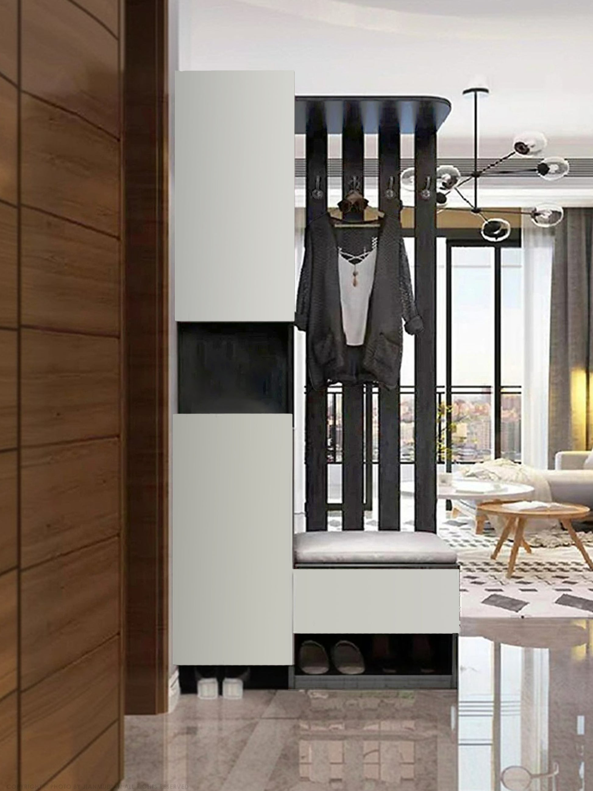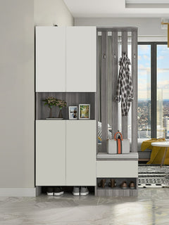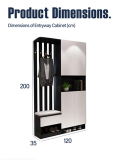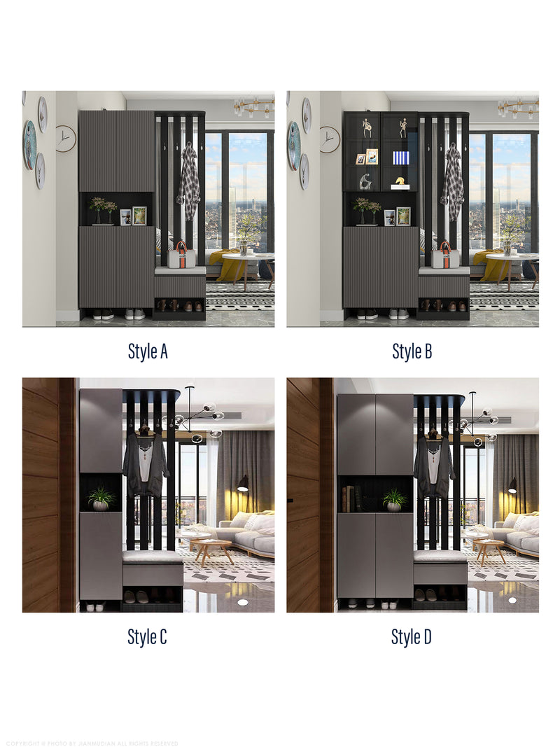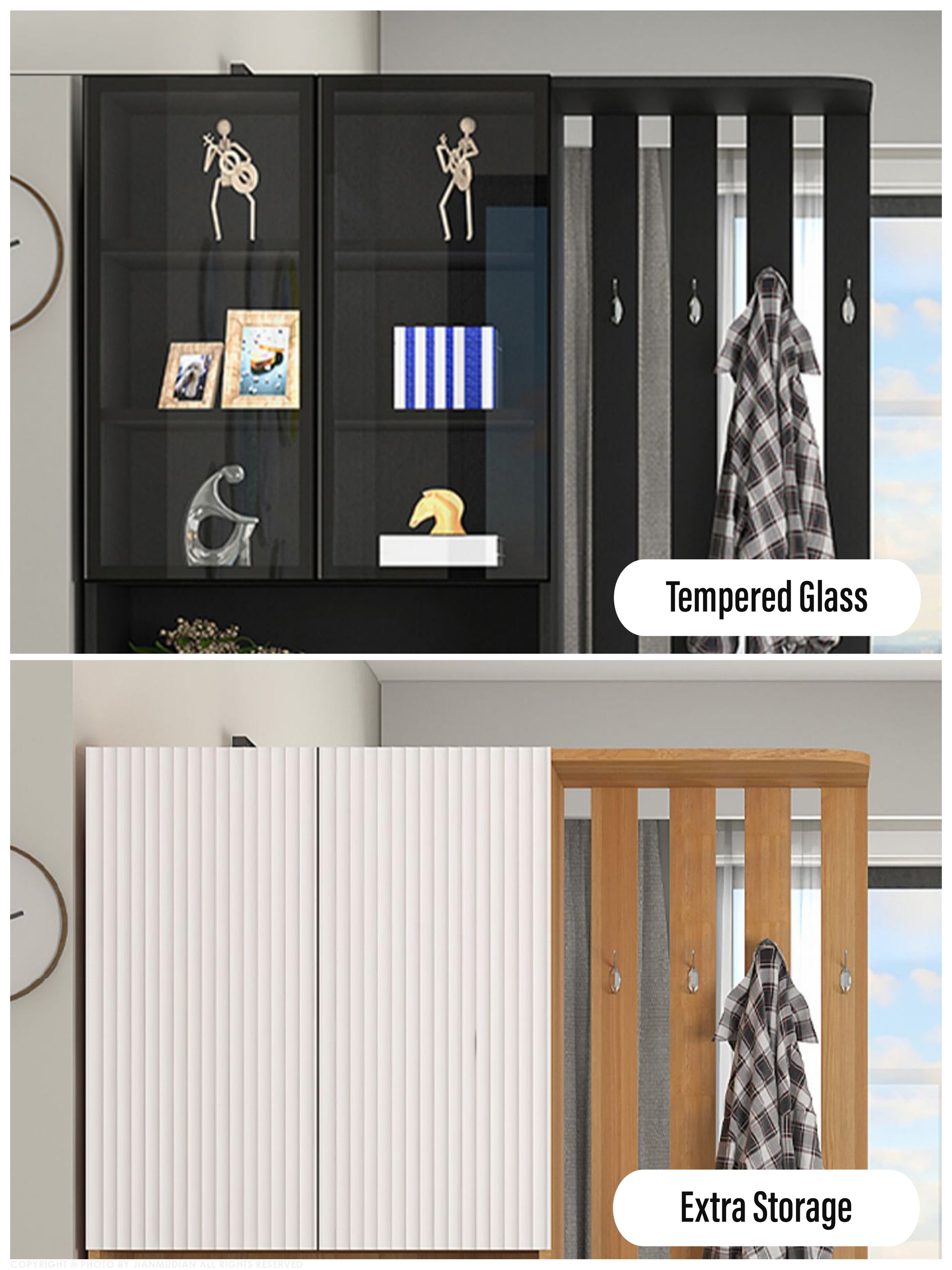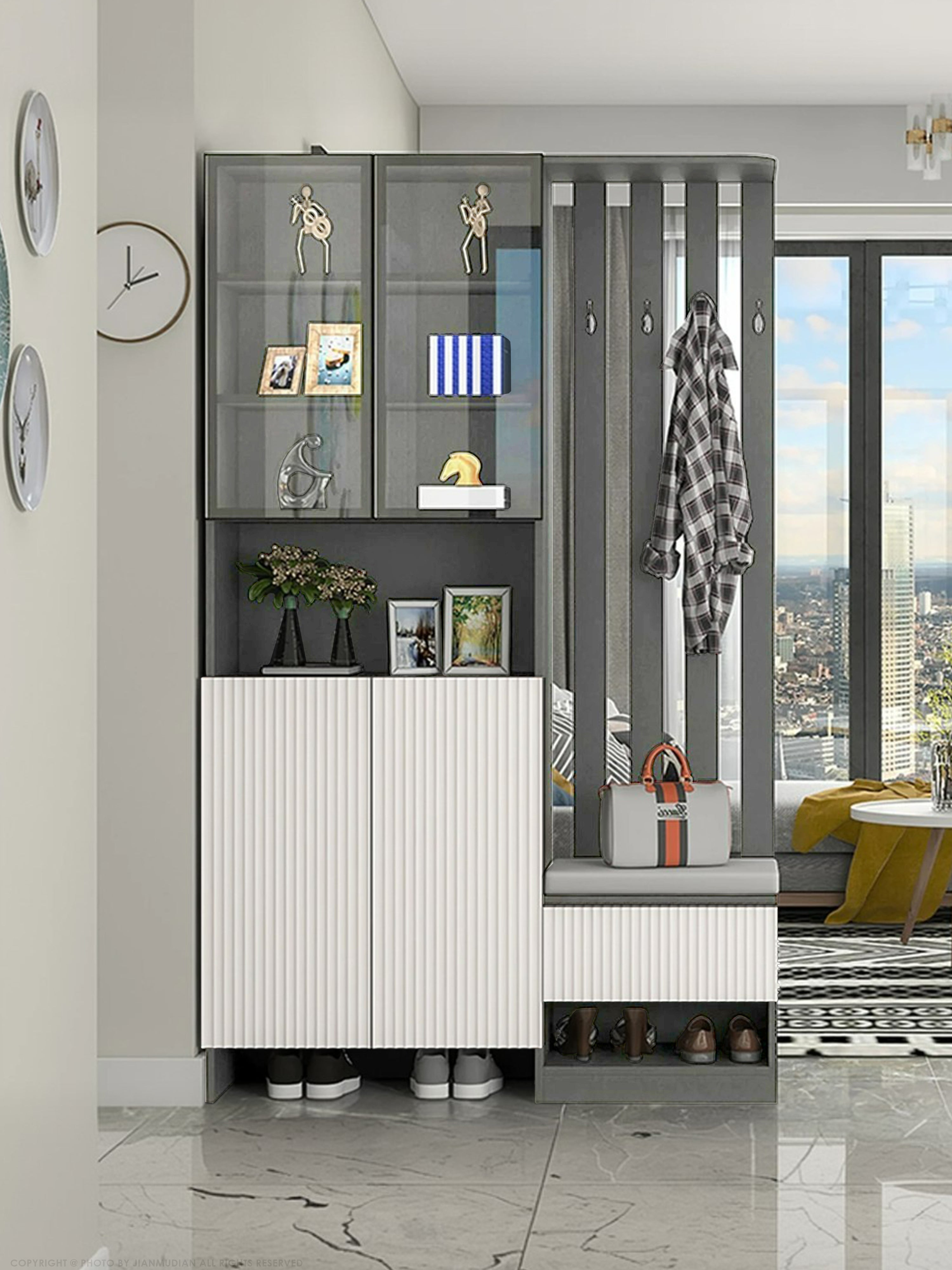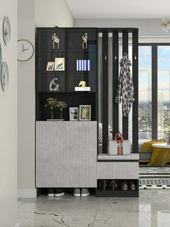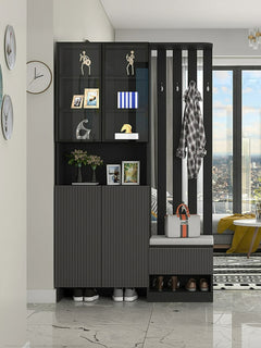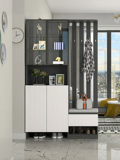 This sleek entryway cabinet offers ample storage and style. With customizable open shelves, glass display cabinets, a shoe rack, and a coat rack, it keeps your entryway organized and inviting.