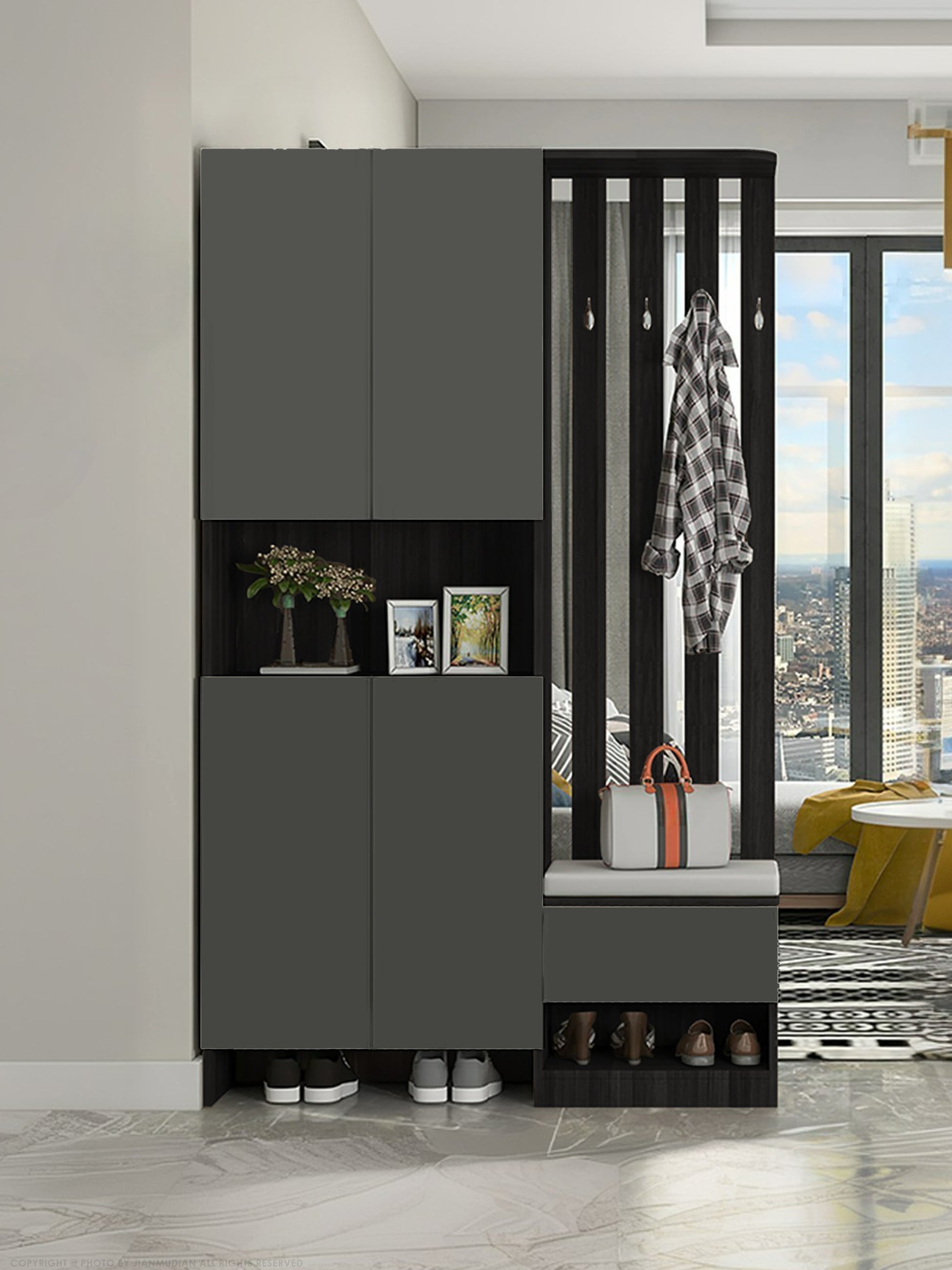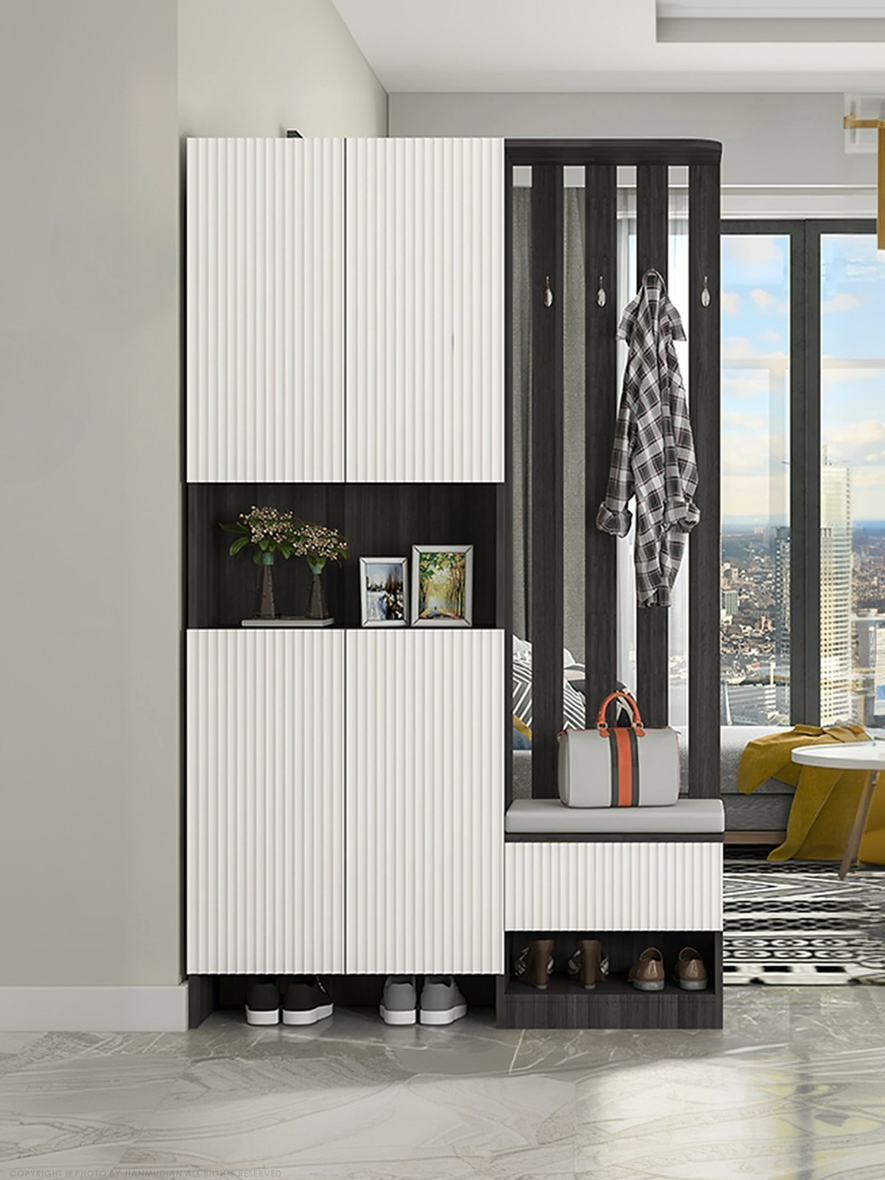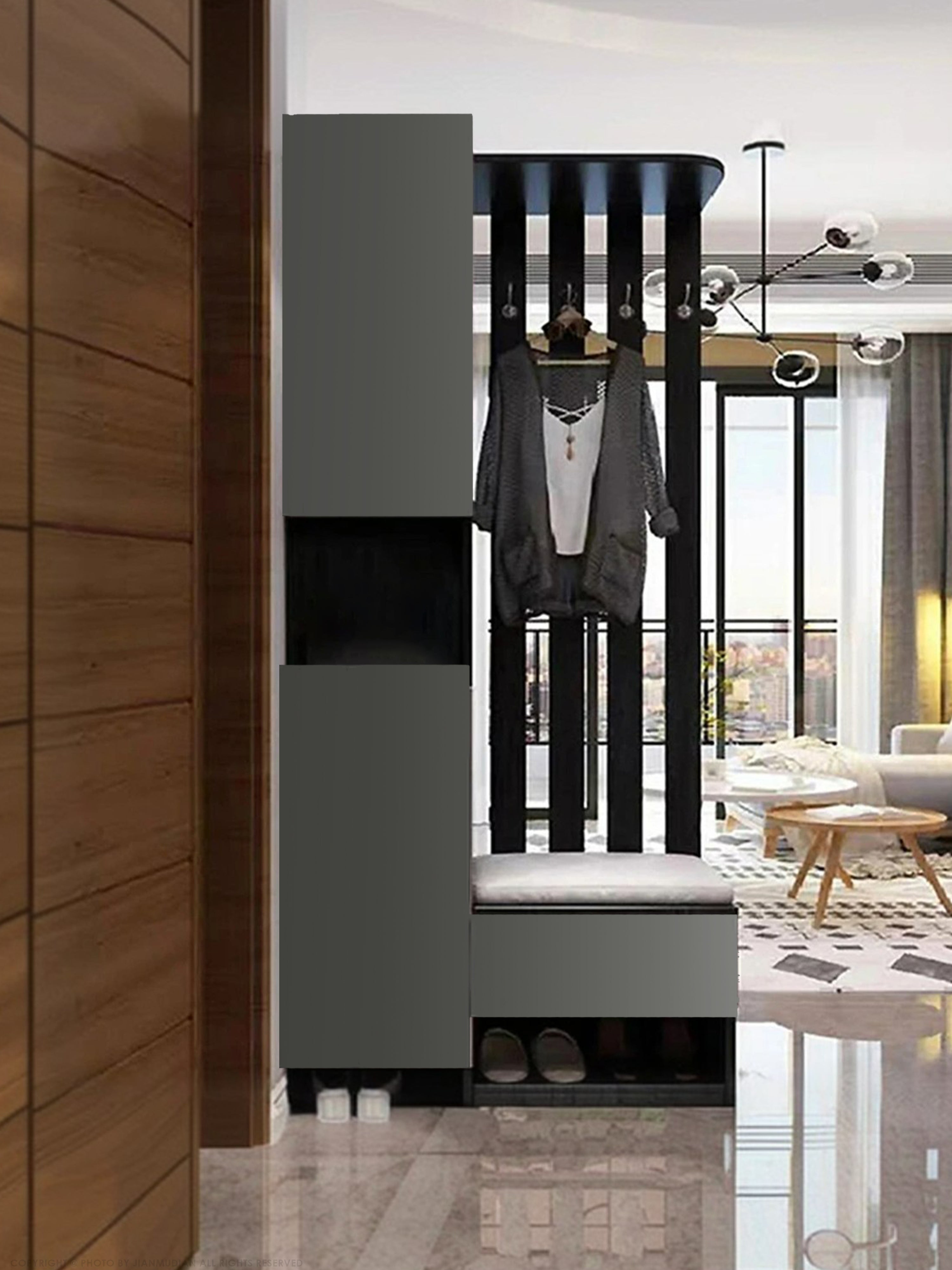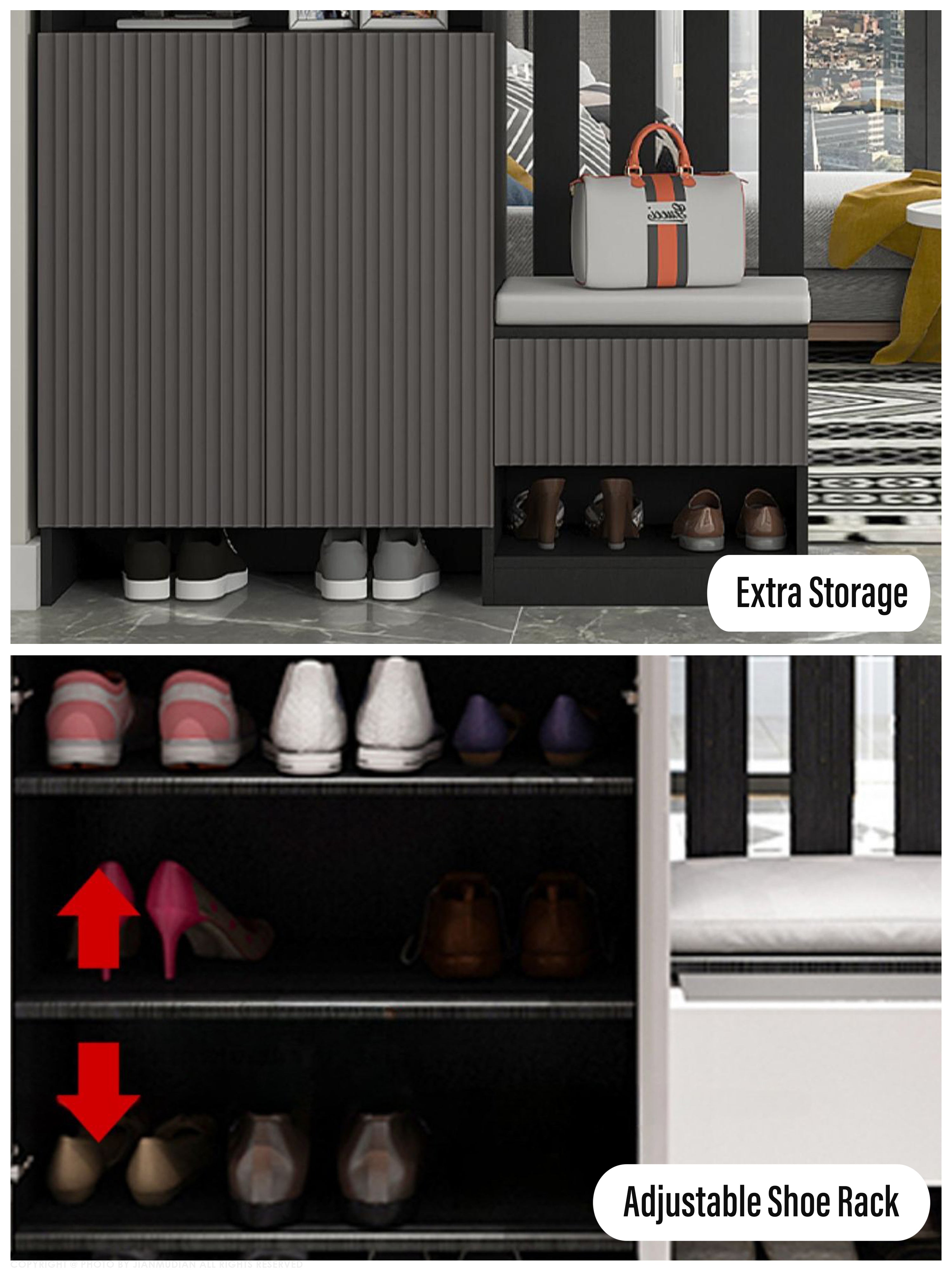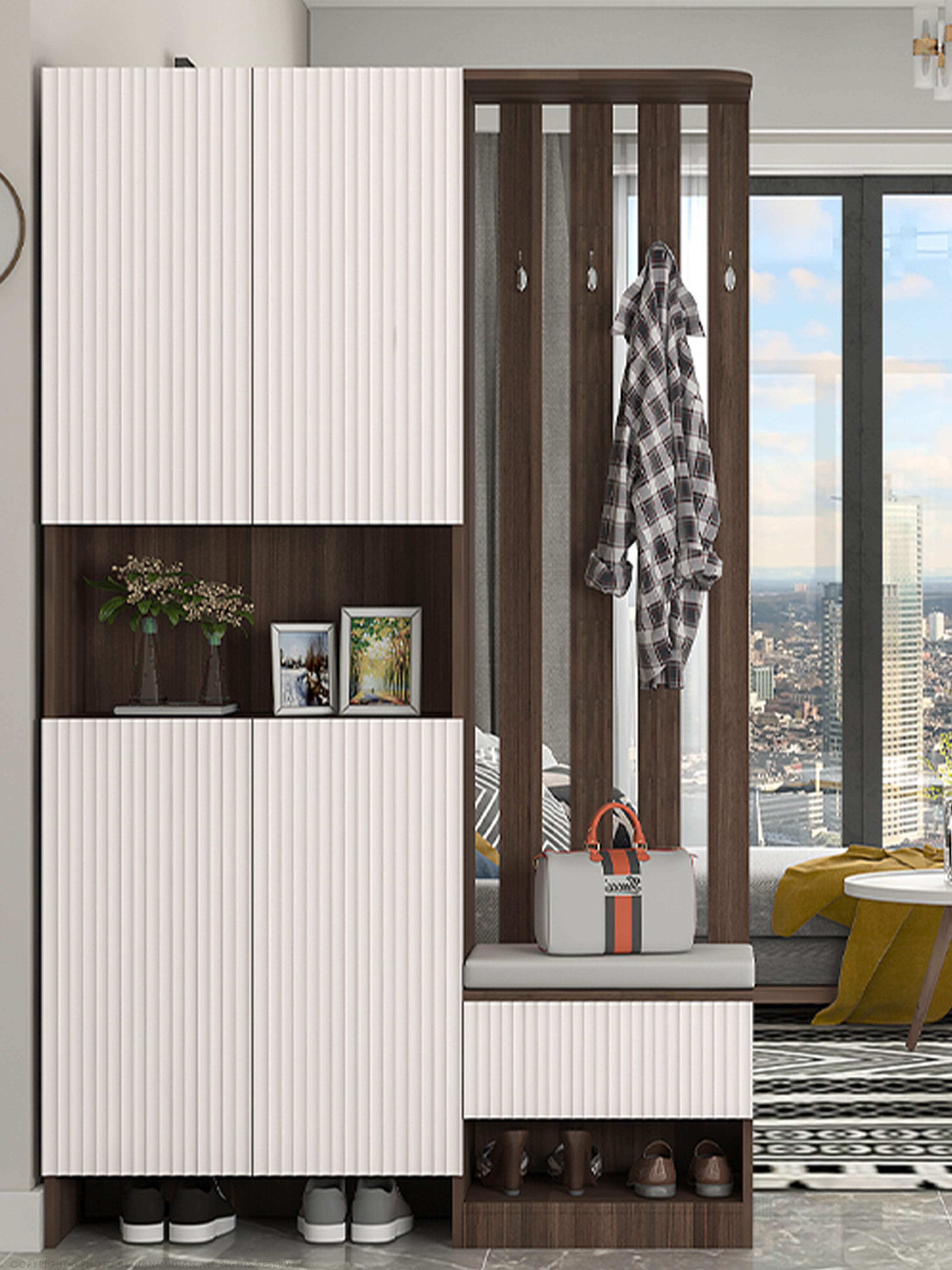 This sleek entryway cabinet offers ample storage and style. With customizable open shelves, glass display cabinets, a shoe rack, and a coat rack, it keeps your entryway organized and inviting.