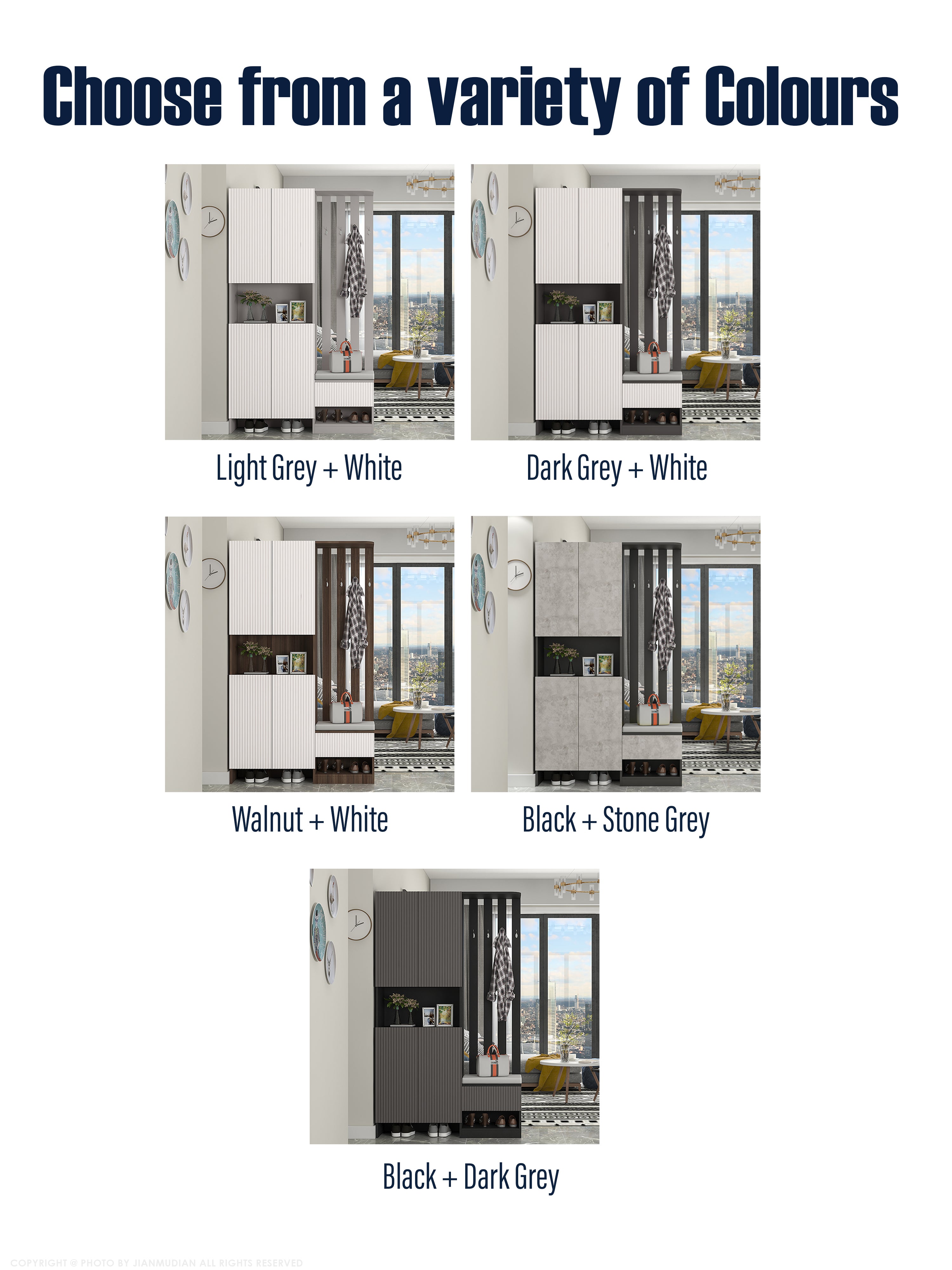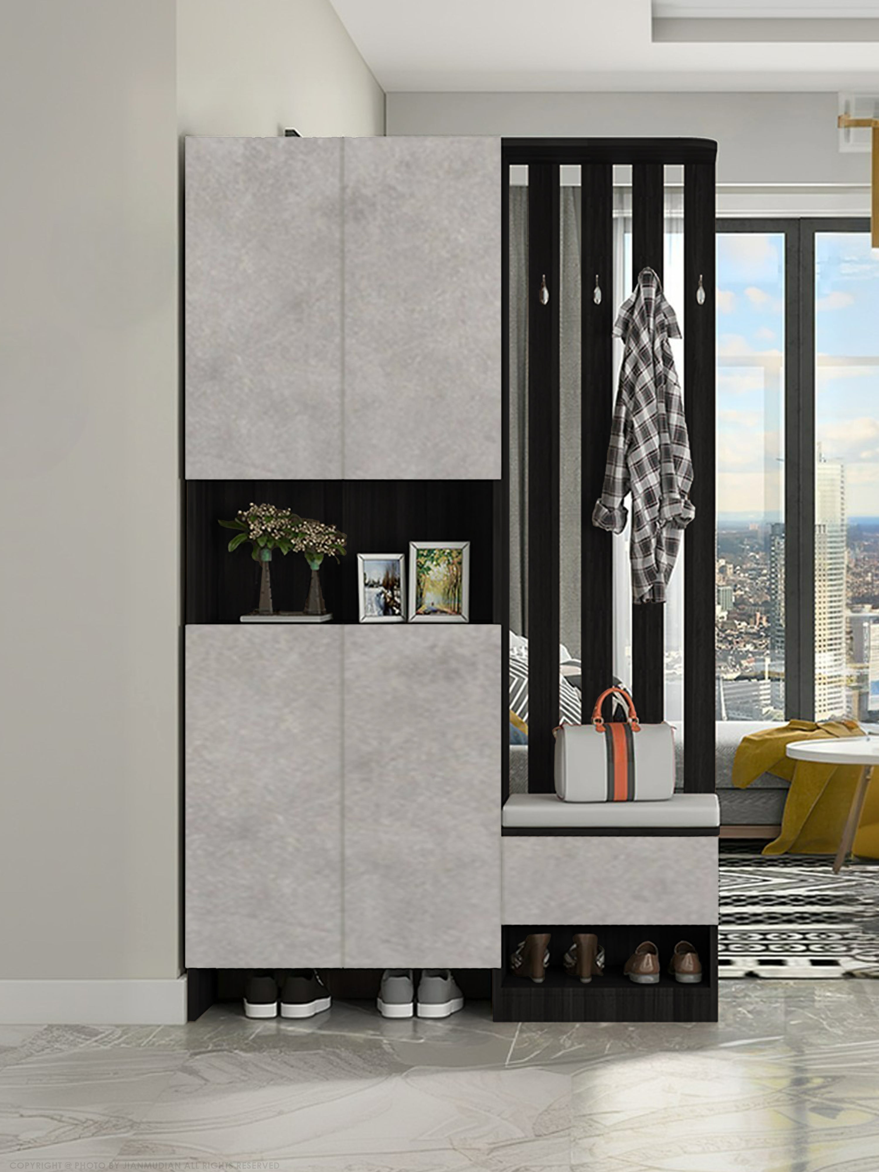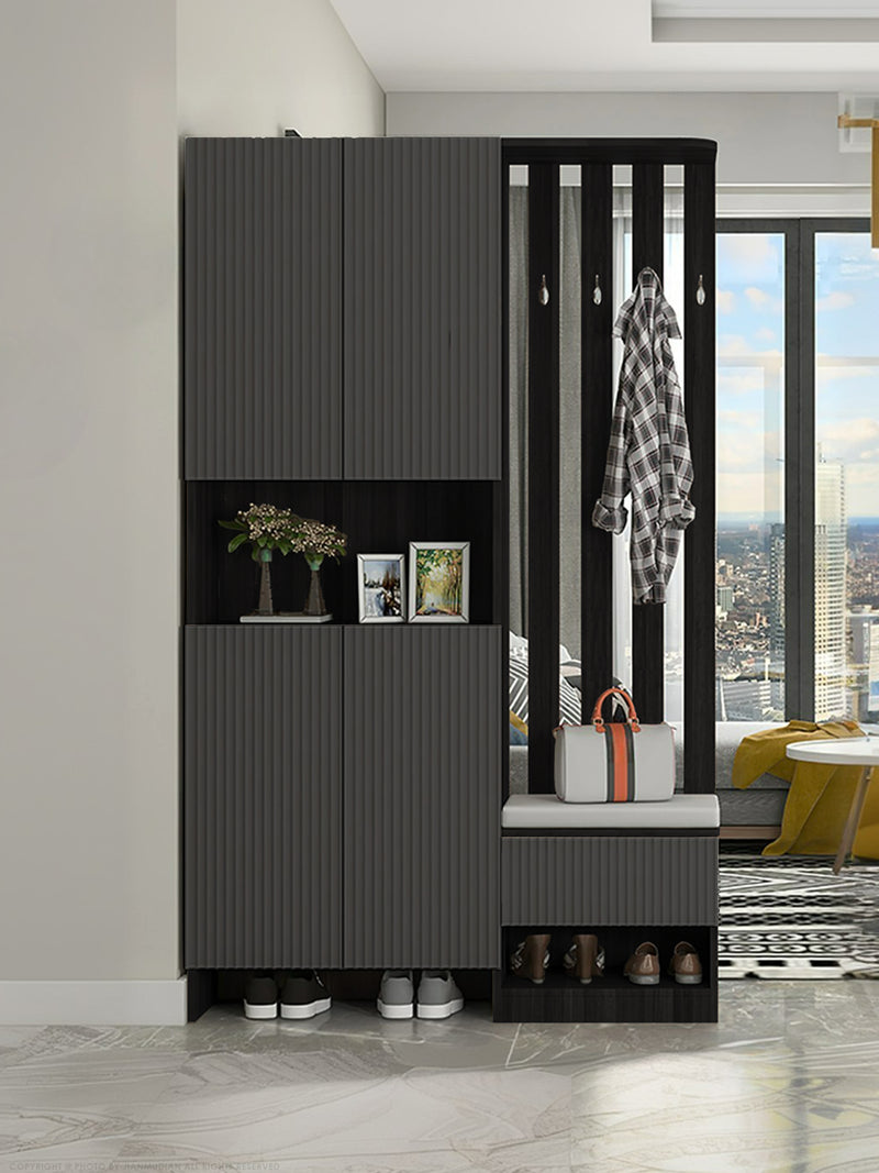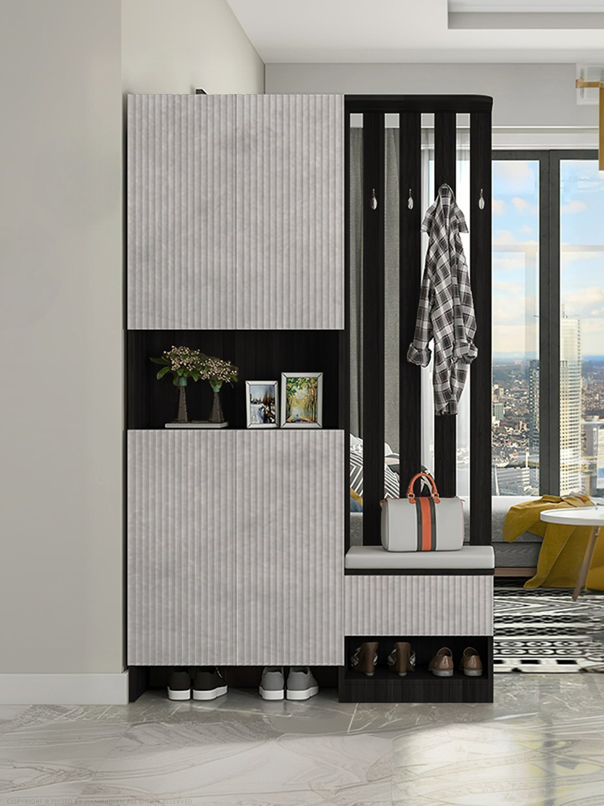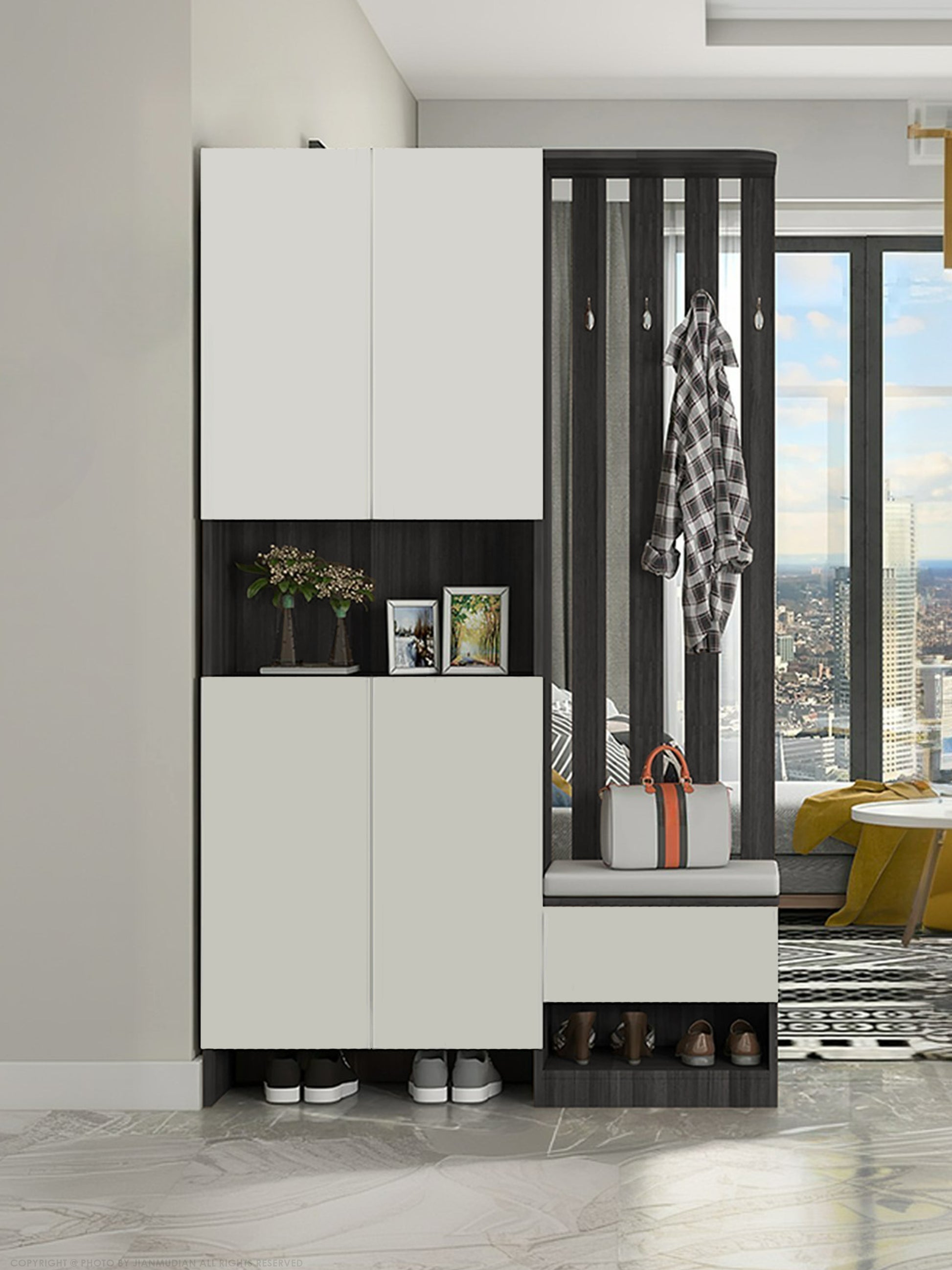 This sleek entryway cabinet offers ample storage and style. With customizable open shelves, glass display cabinets, a shoe rack, and a coat rack, it keeps your entryway organized and inviting.