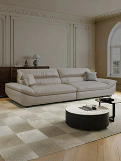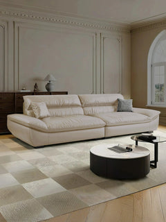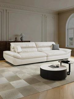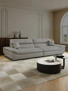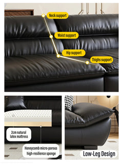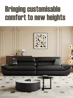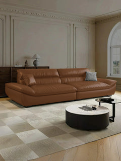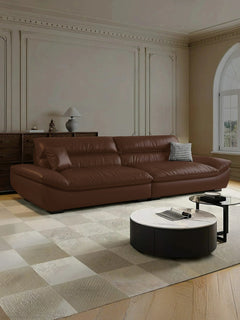 Unwind in Sophistication with the Italian Modern Minimalist Top-Grain Leather Sofa. This sleek and stylish sofa is upholstered in buttery-soft top-grain leather, inviting you to curl up and relax in comfort. The solid wood frame provides exceptional support and durability, ensuring this sofa will be a welcoming centerpiece of your living room for years to come.