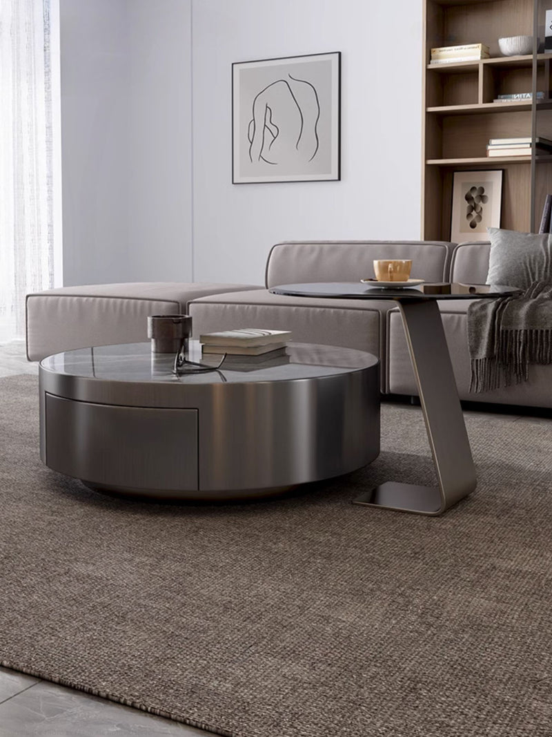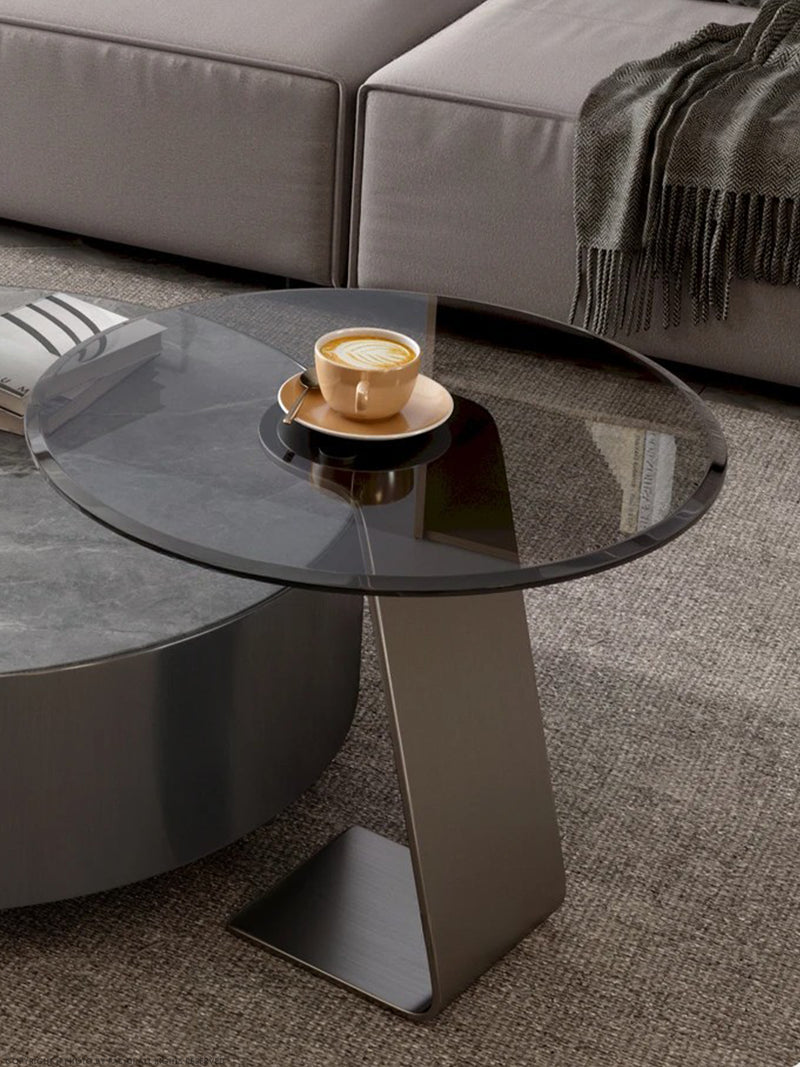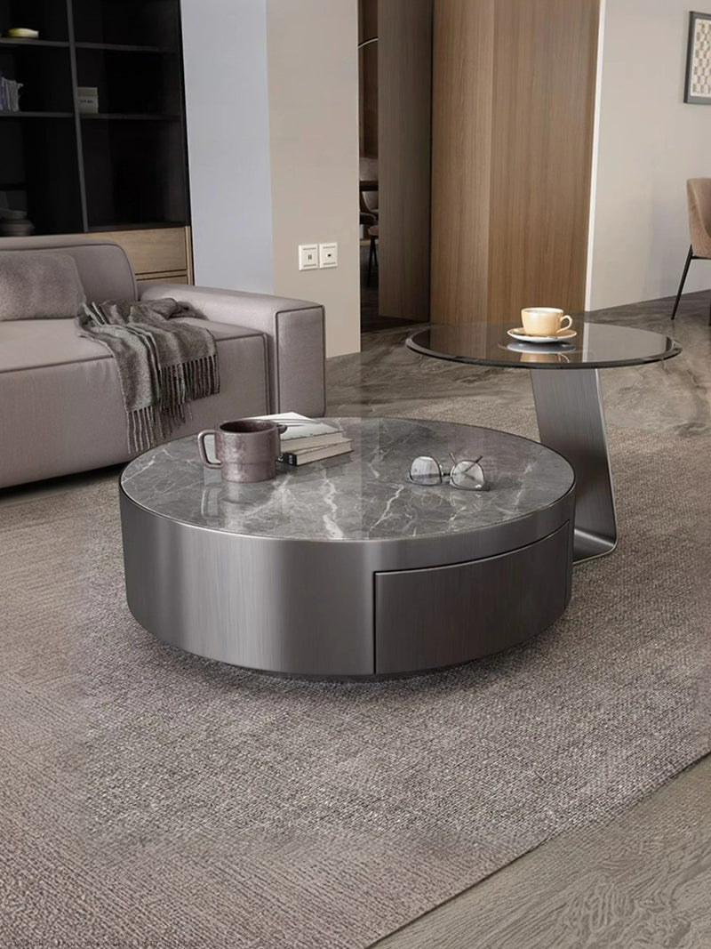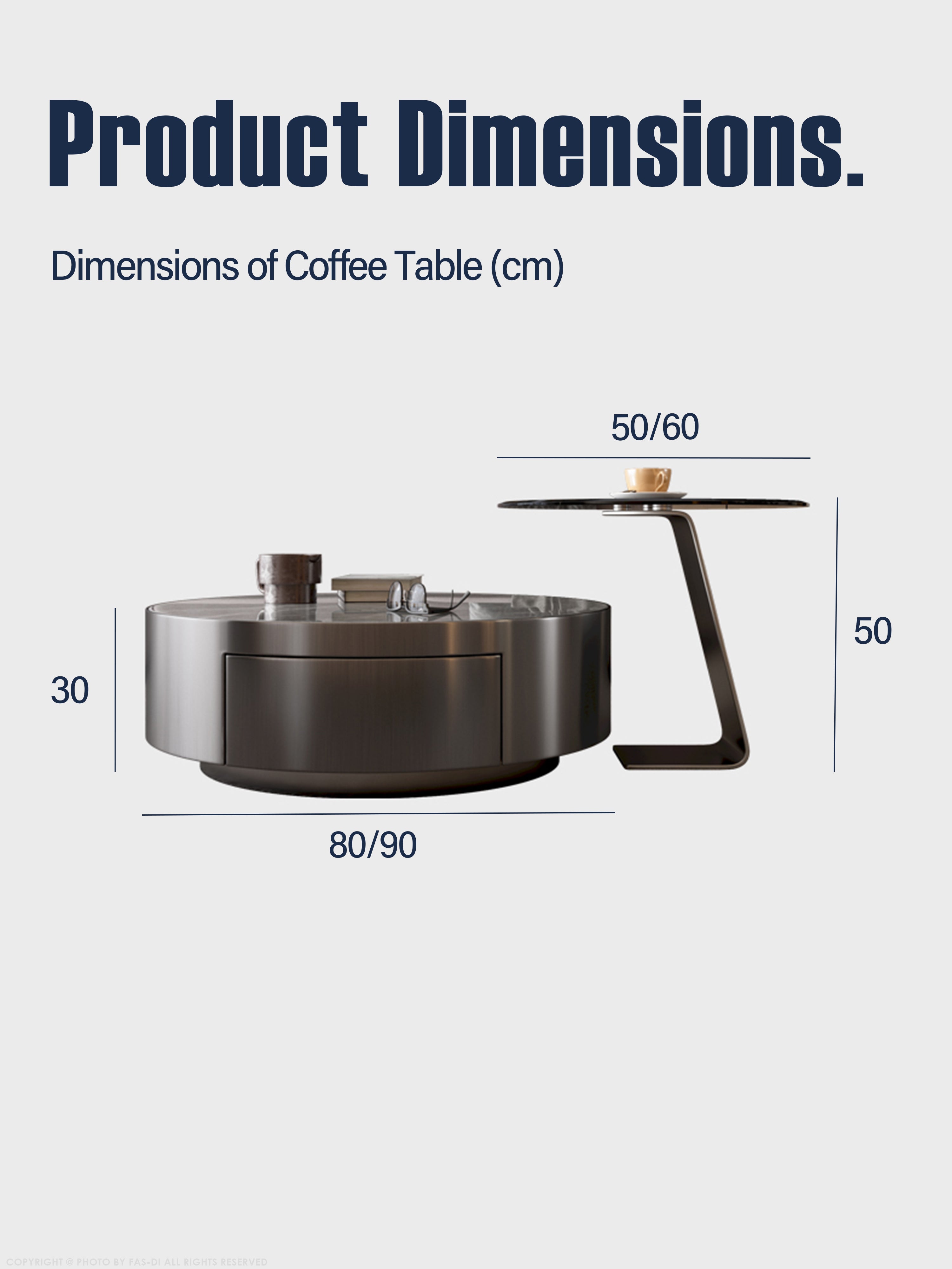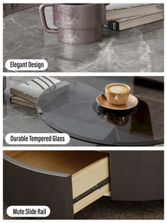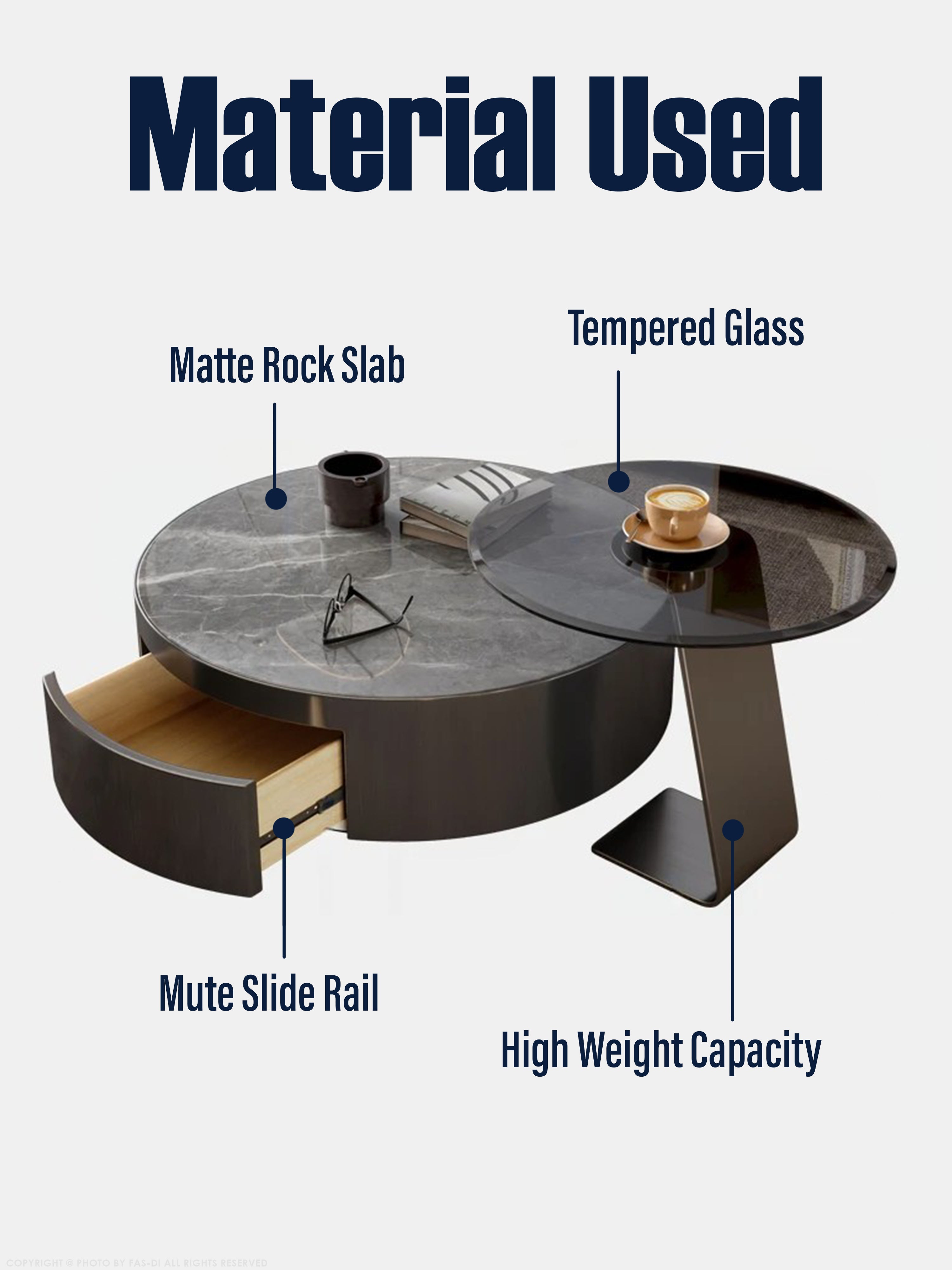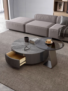 Elevate your living space with this sophisticated and functional coffee table. The sleek, round design features a luxurious marble-effect top, complemented by a contrasting glass nesting table for versatile use. A hidden drawer provides storage, keeping your space clutter-free. The sturdy base in a rich, dark finish adds a touch of modern elegance, making this table a perfect center piece for any contemporary living room.