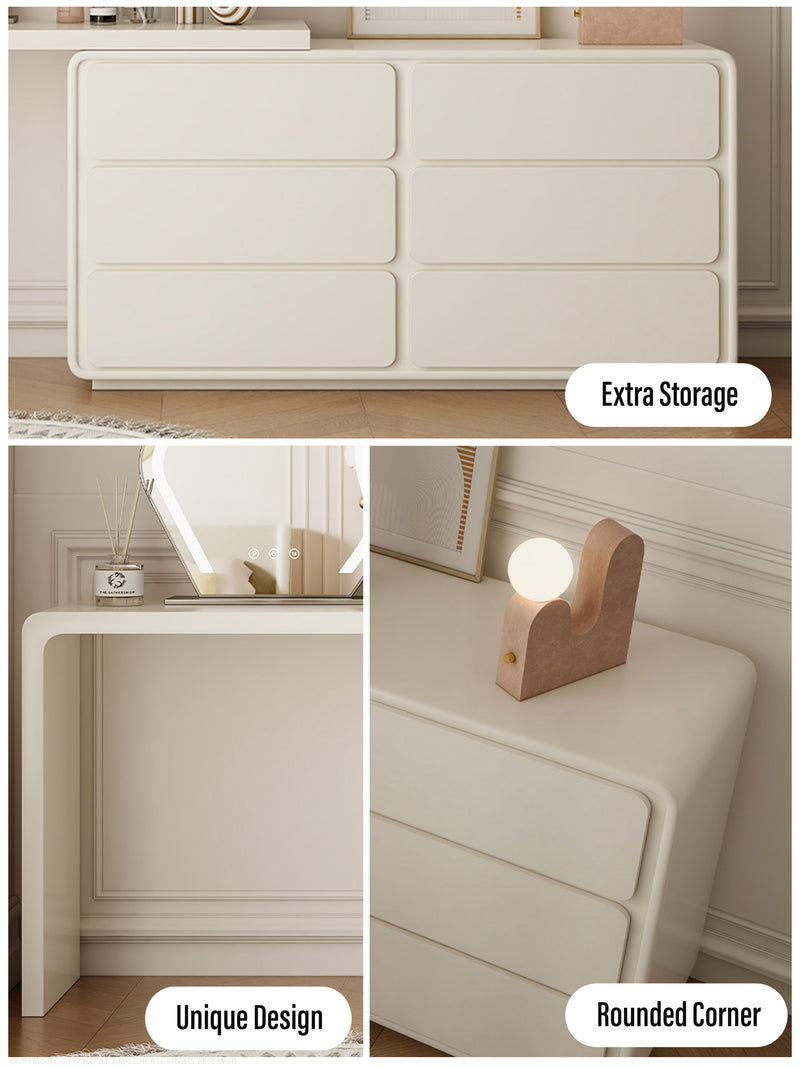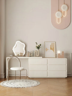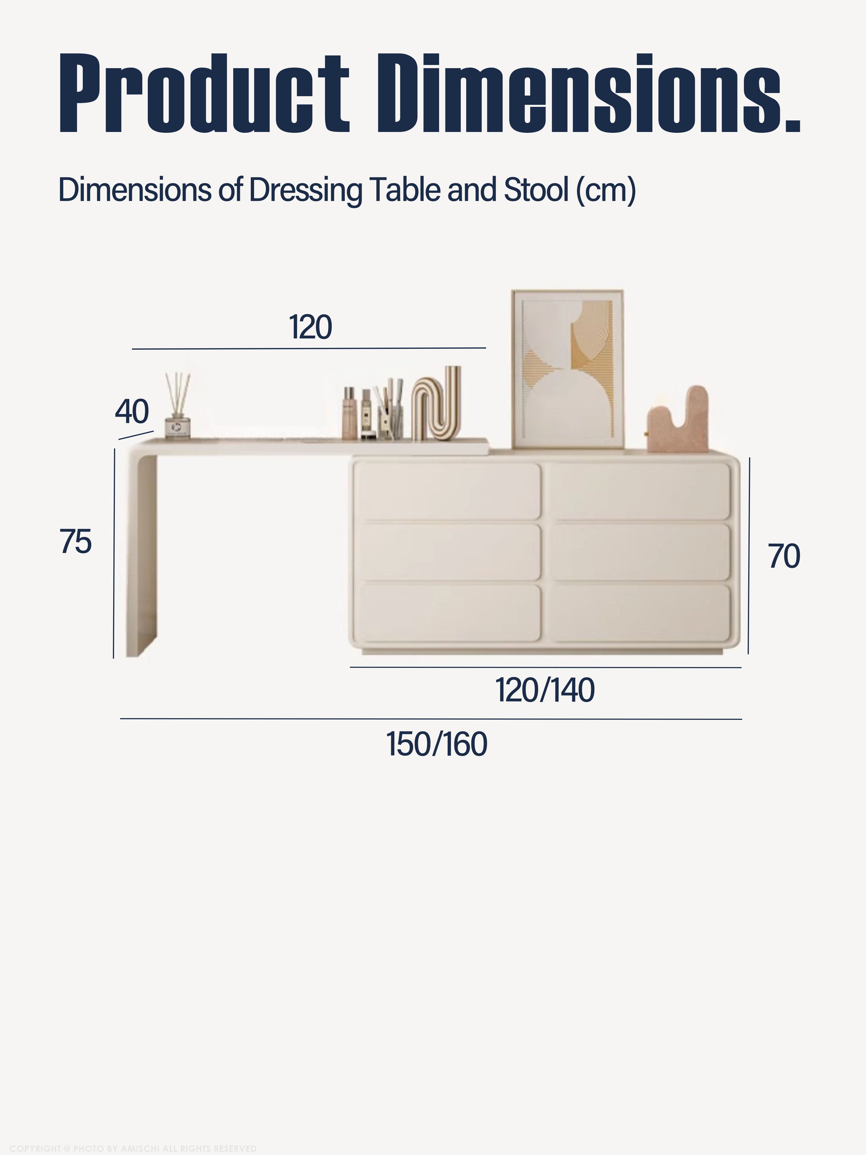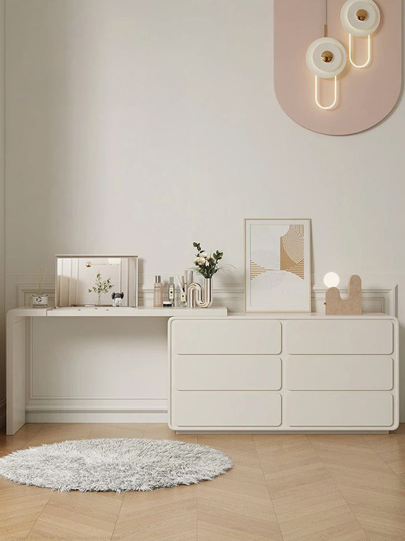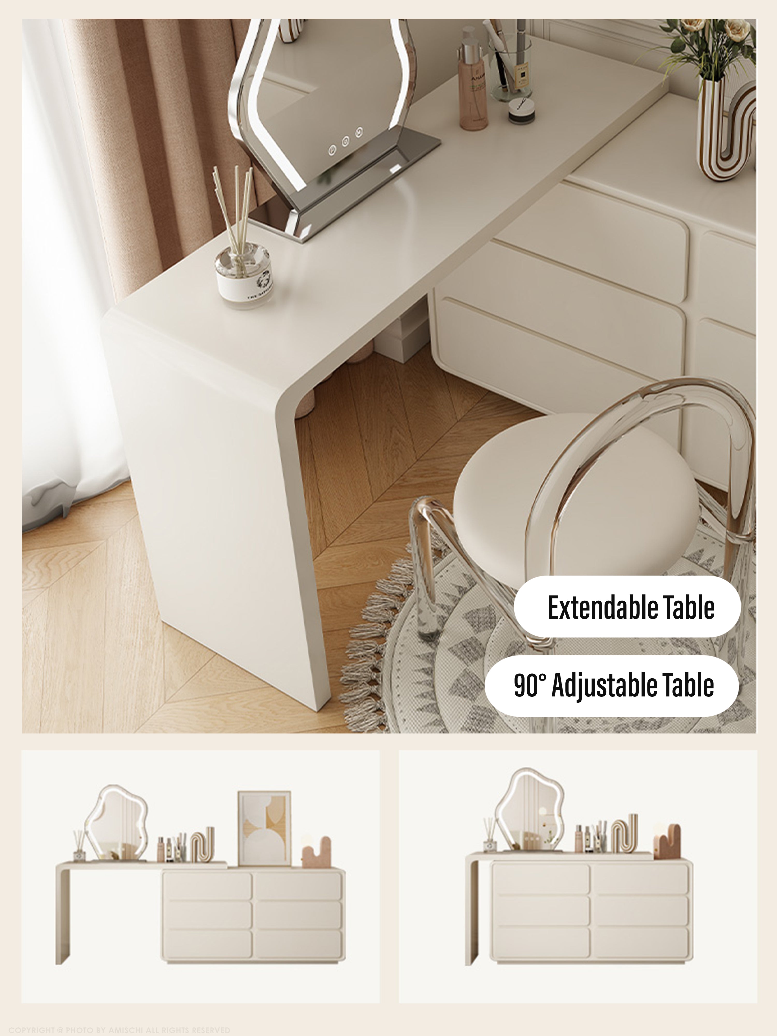 Modern, stylish dressing table inspired by French design. It combines the functionality of a dressing table and a storage unit, often with an extendable feature to accommodate different spaces.
