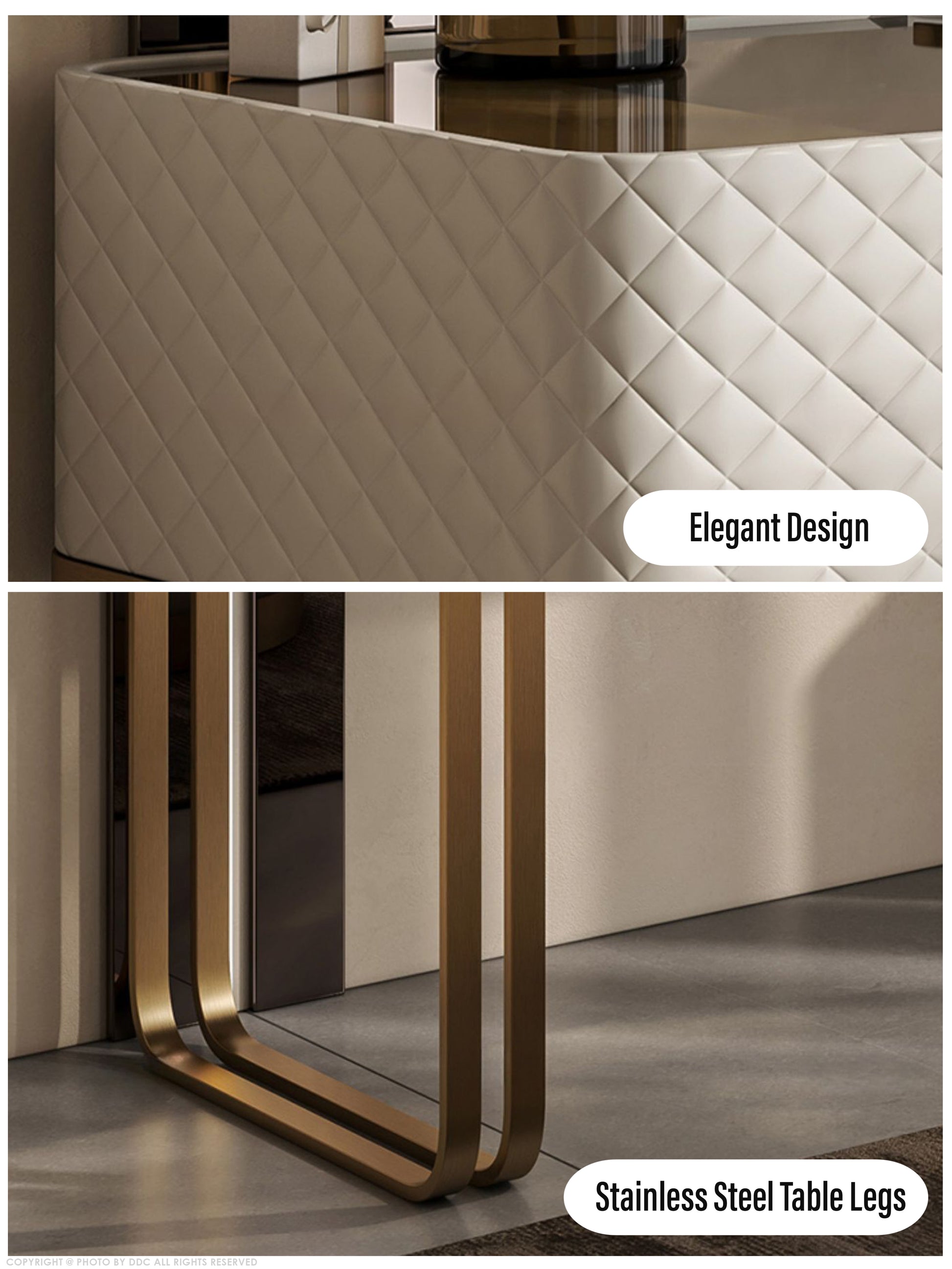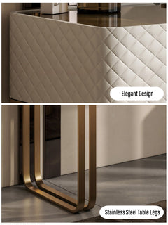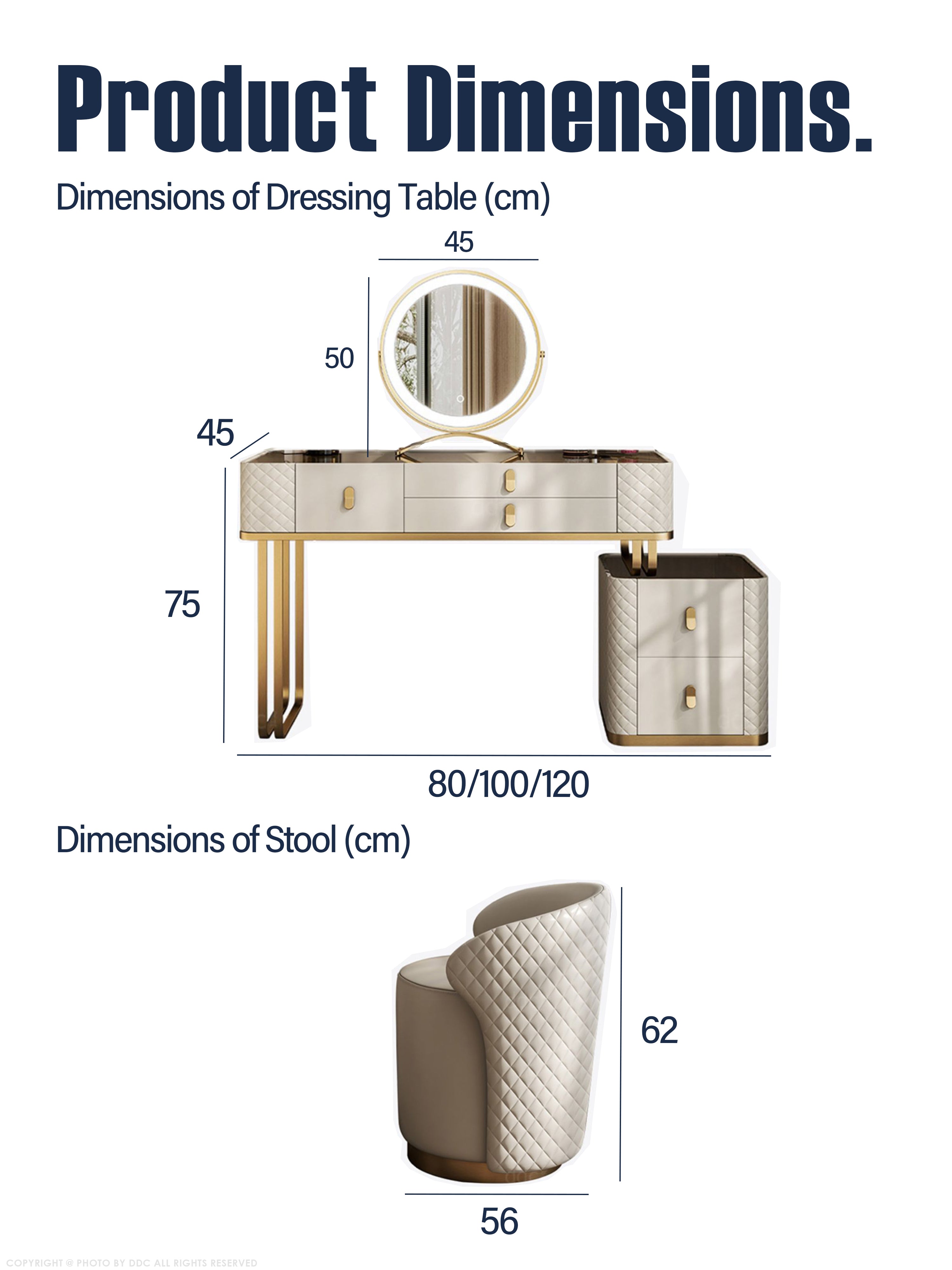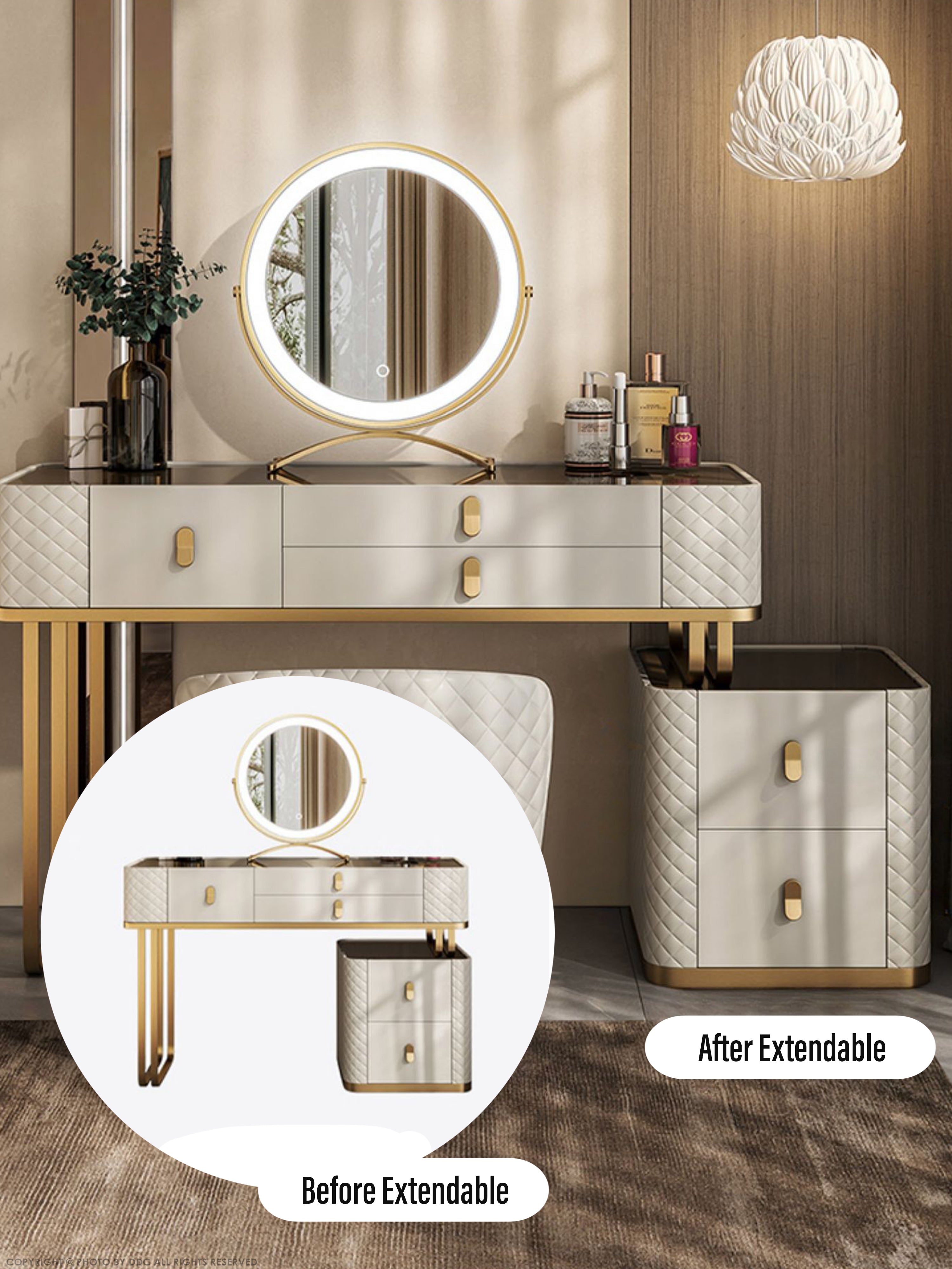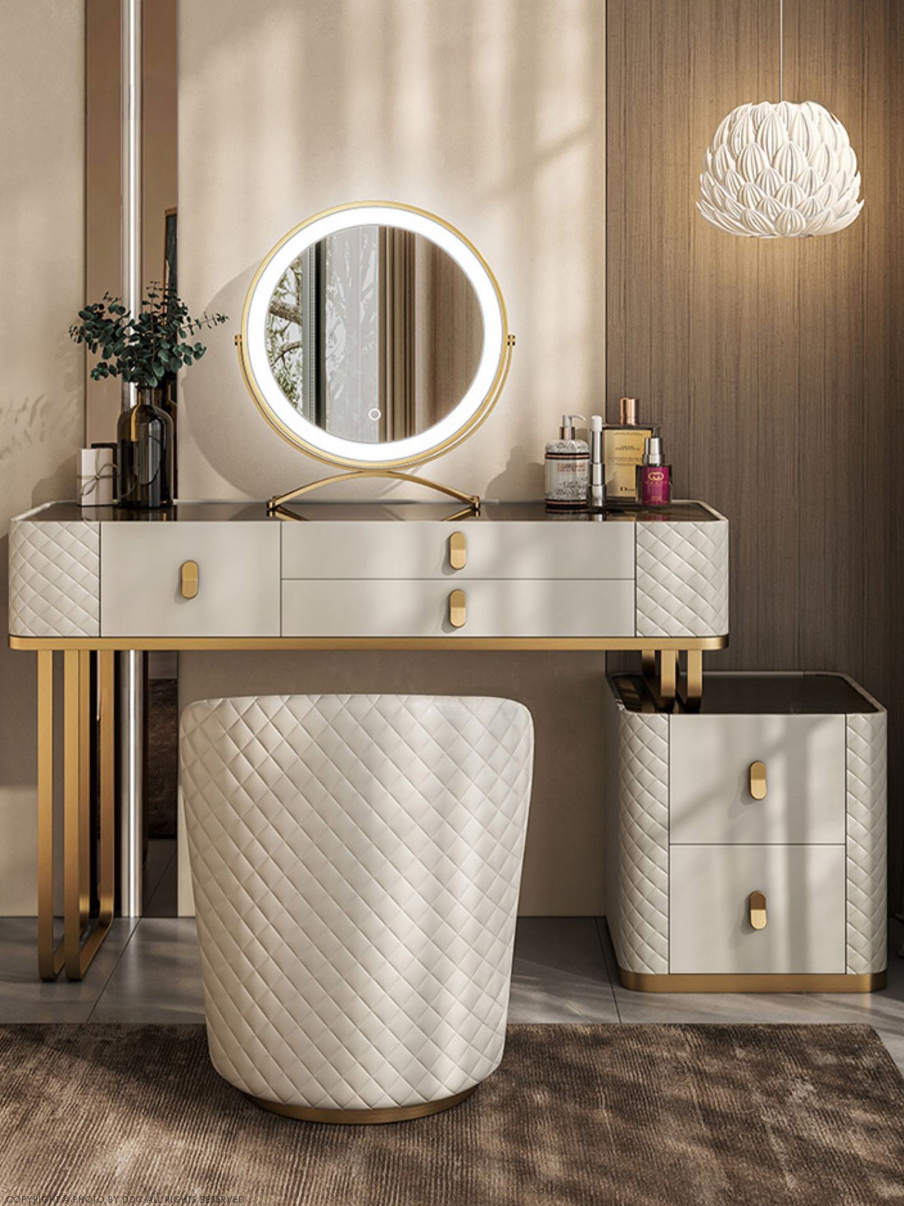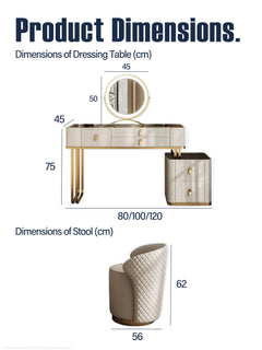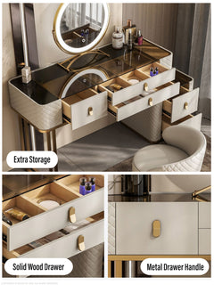 This a luxurious and functional dressing table. Crafted with premium materials like solid wood and leather, it features a spacious tabletop, ample storage, and built-in LED lights for flawless makeup application. Elevate your daily routine with this stunning piece.
