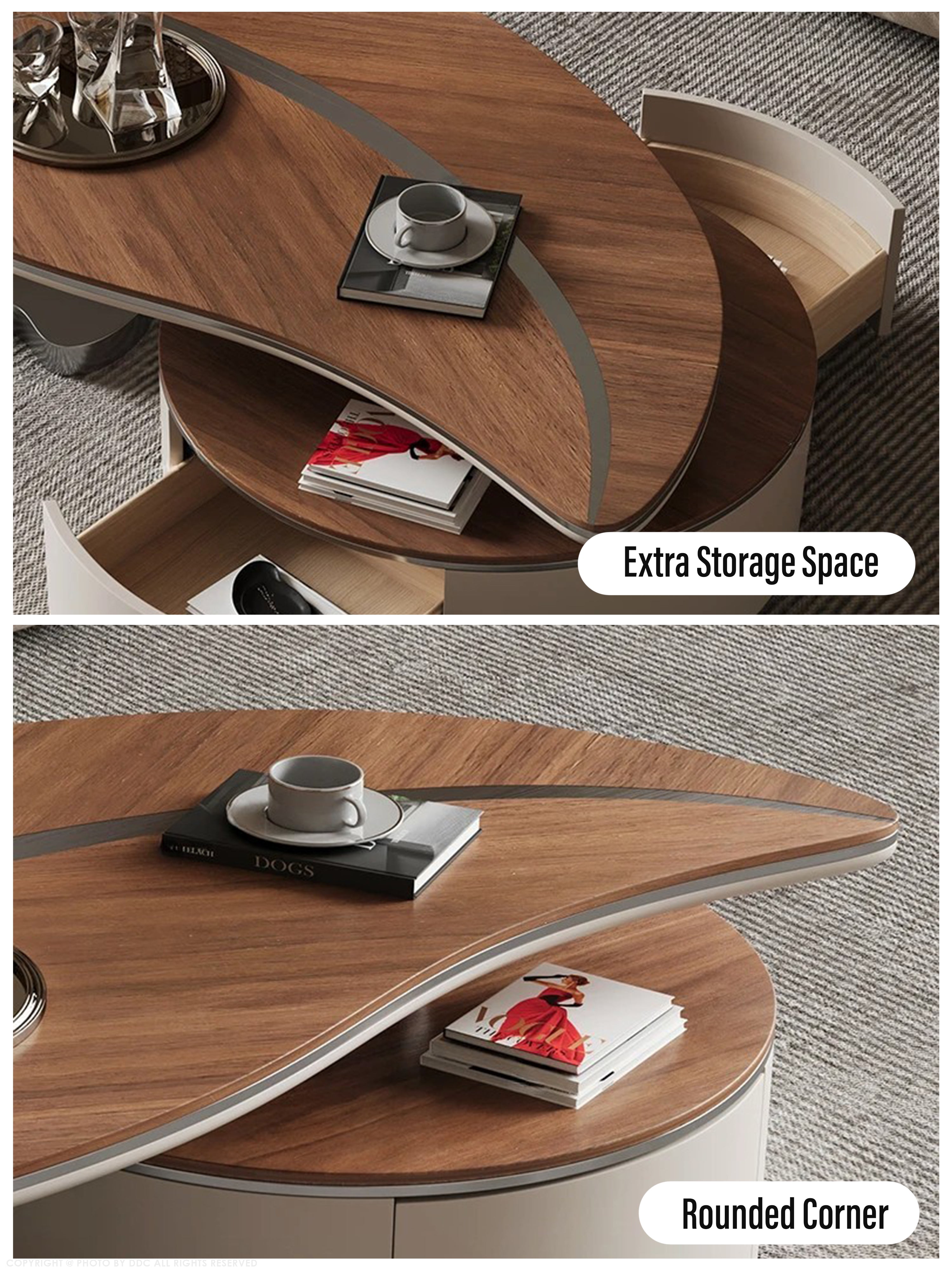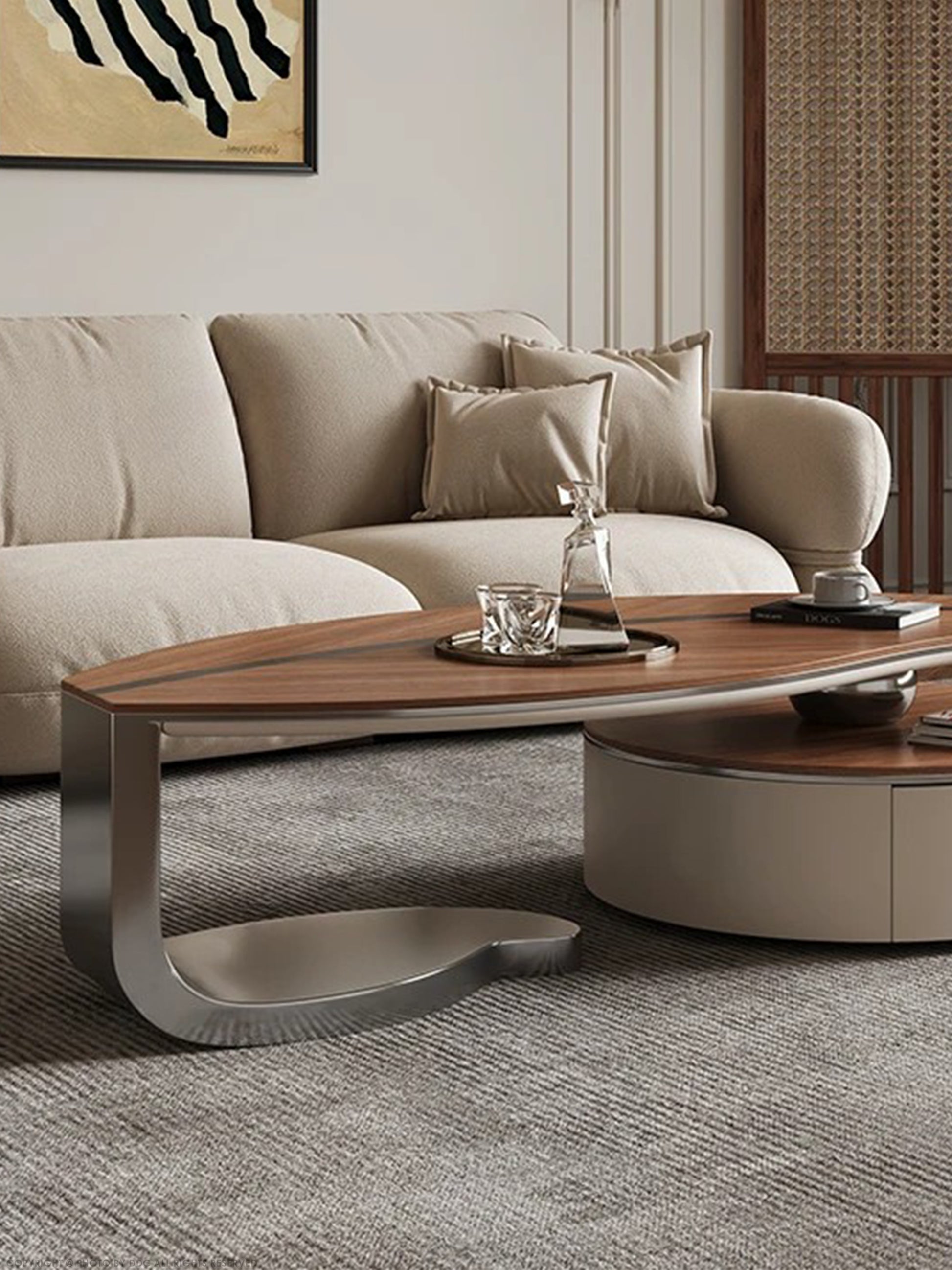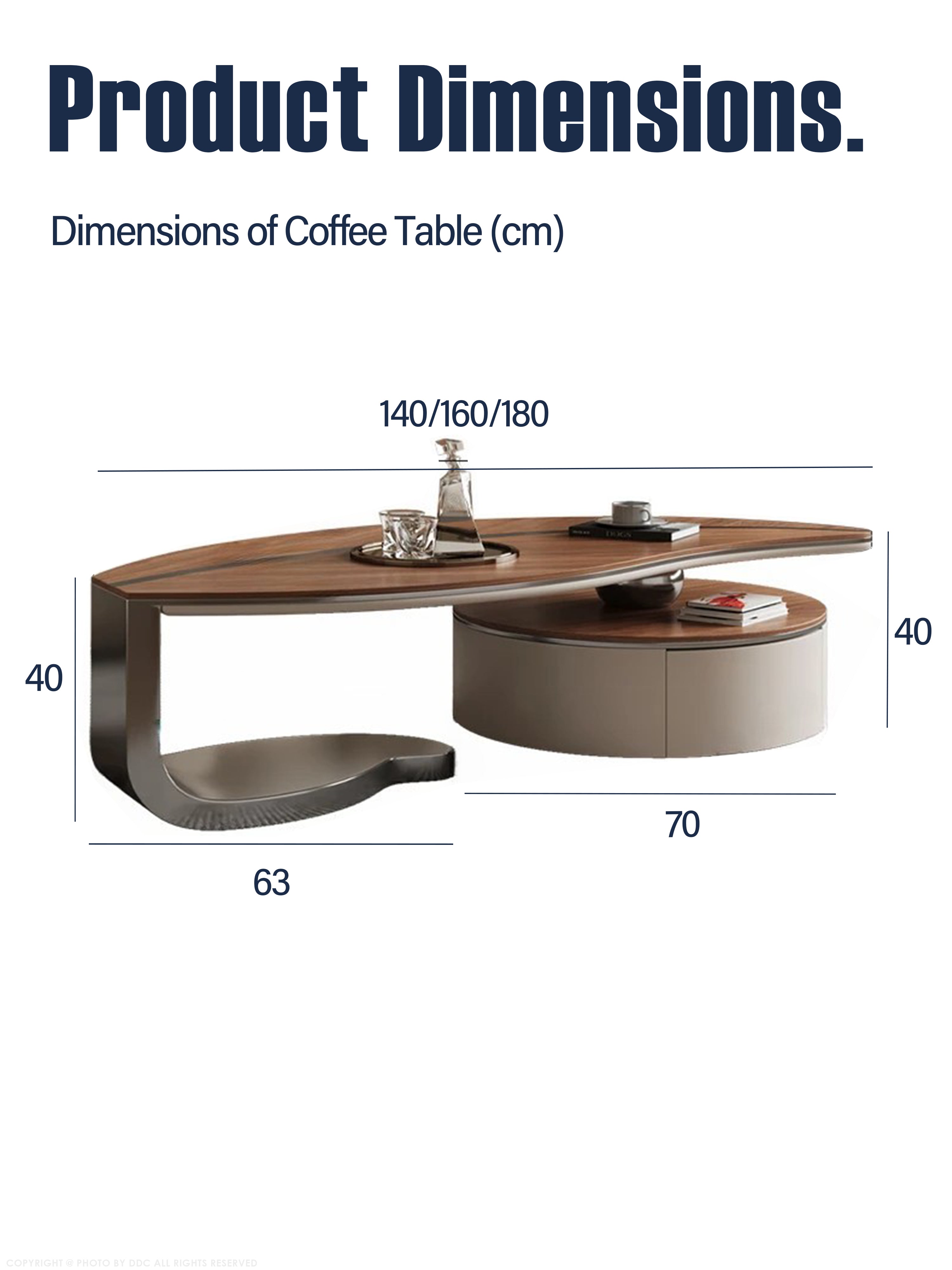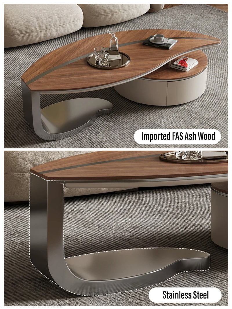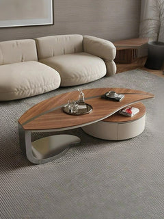 Bring a touch of nature and modern elegance to your living room with this unique coffee table. Its organic, leaf-shaped design, crafted from warm wood tones, adds a touch of natural beauty to any space. The contrasting metallic base adds a contemporary touch, and the combination of materials creates a stunning center piece that will effortlessly elevate your home décor.