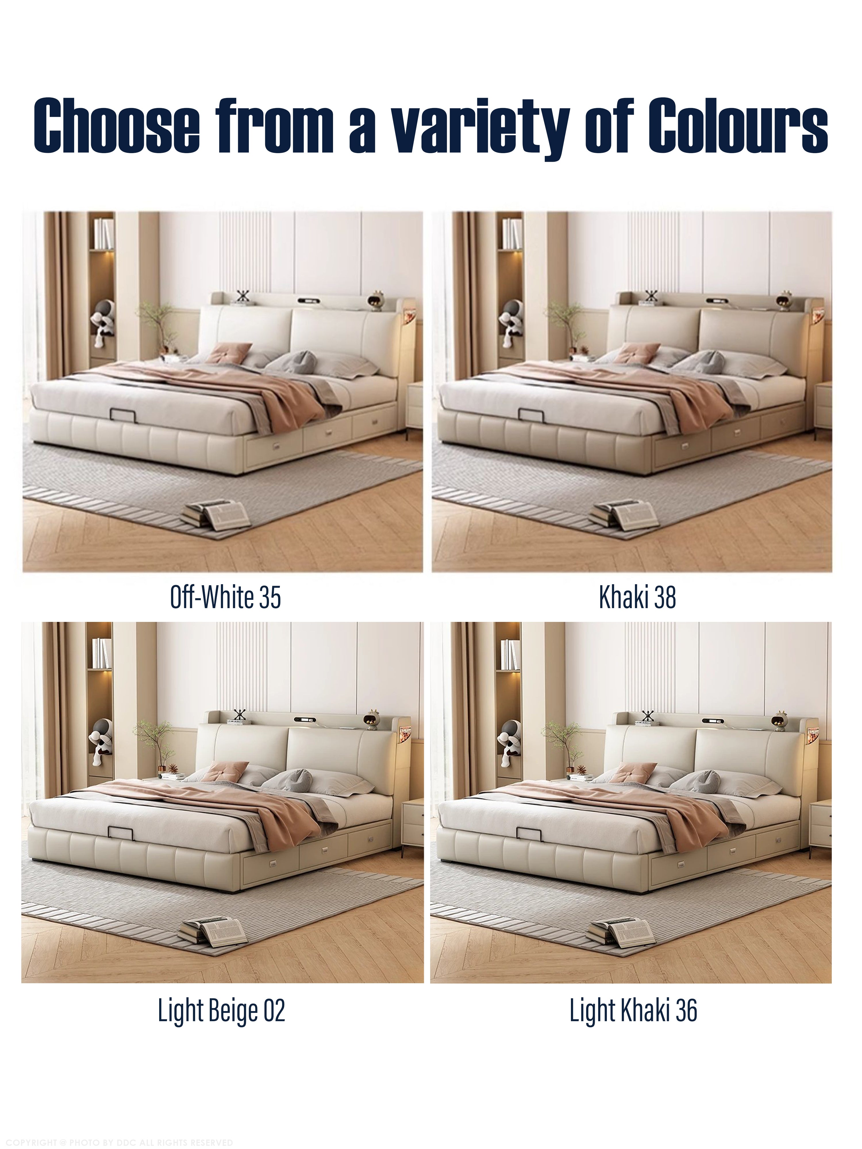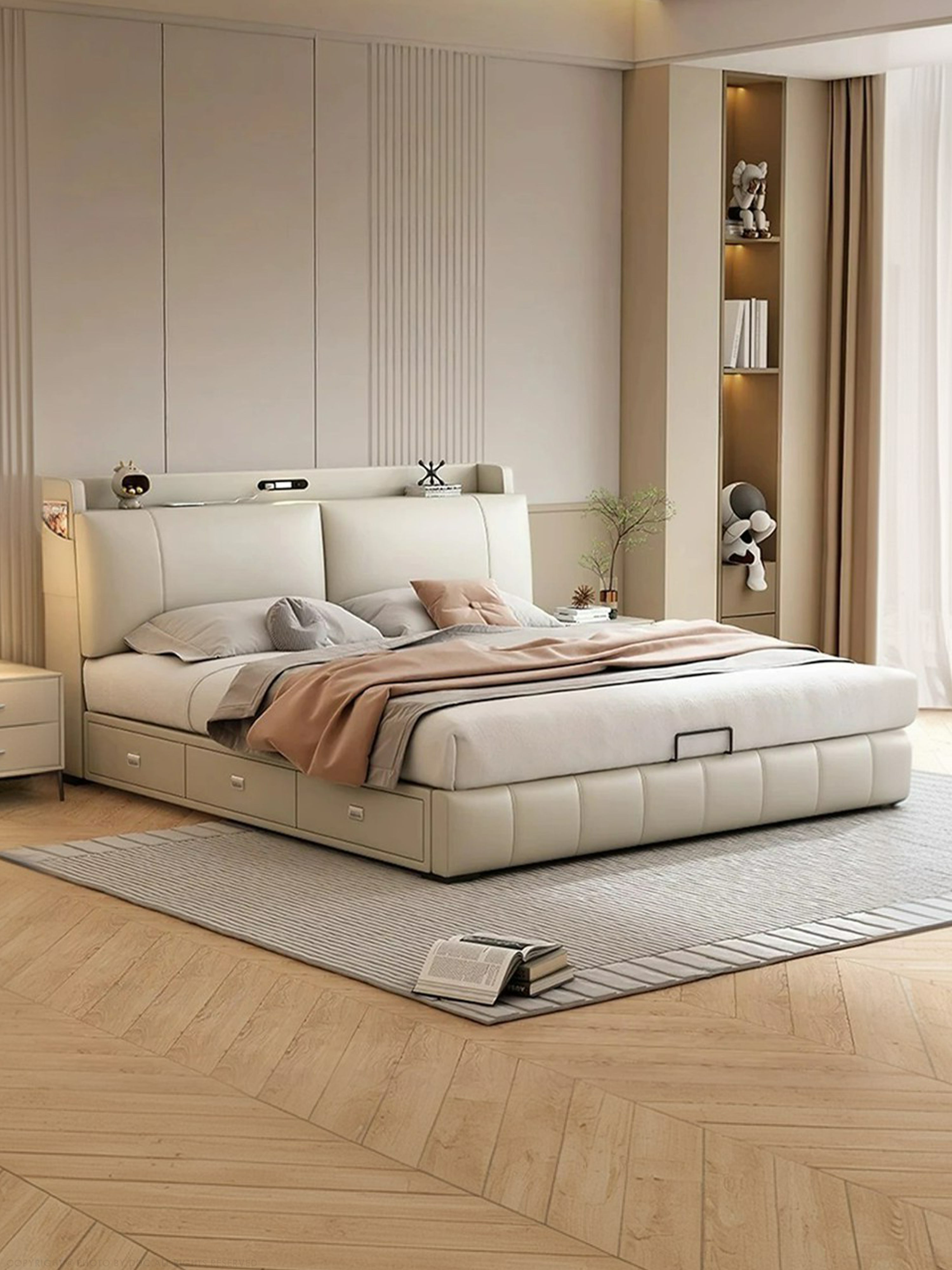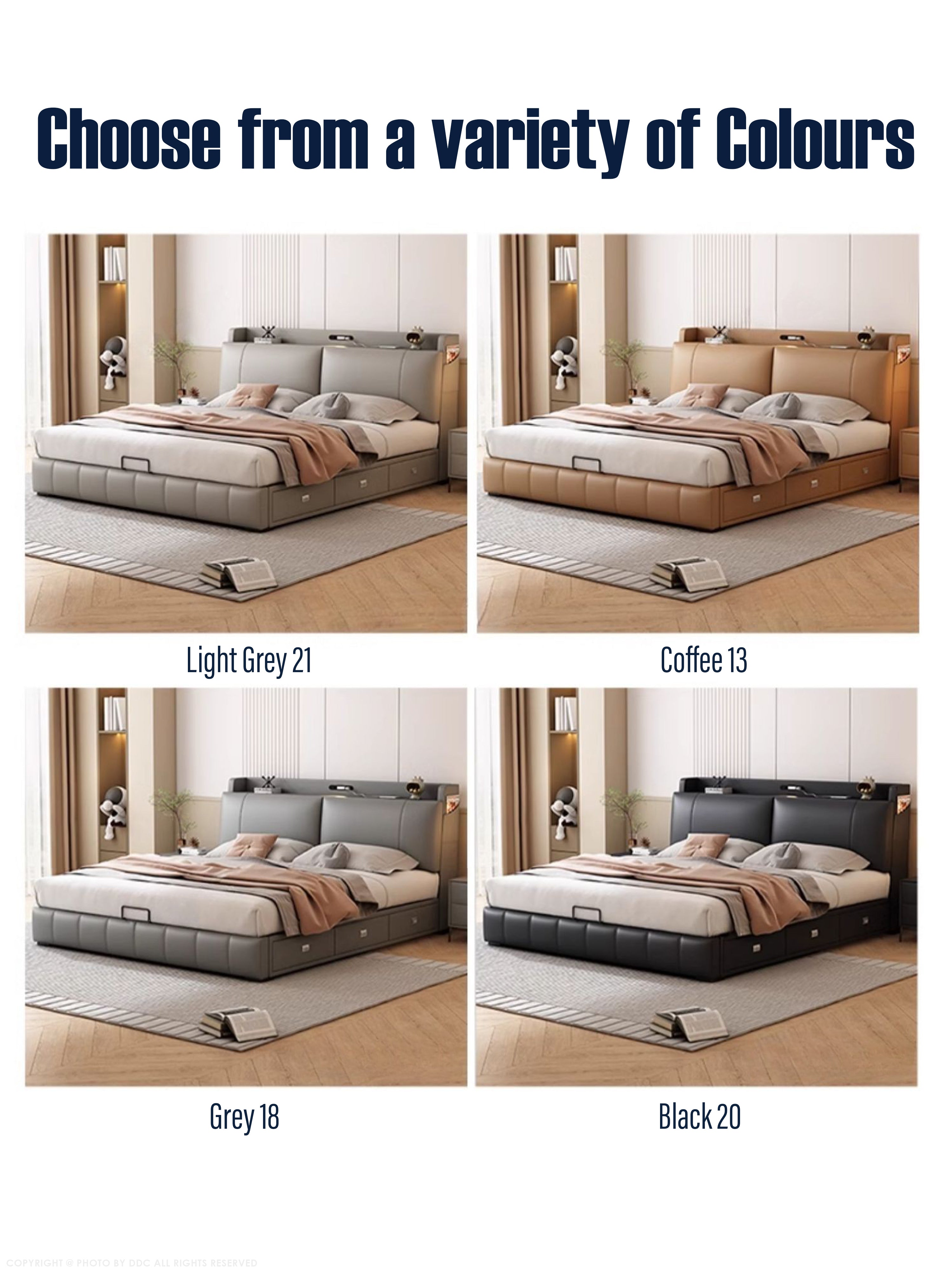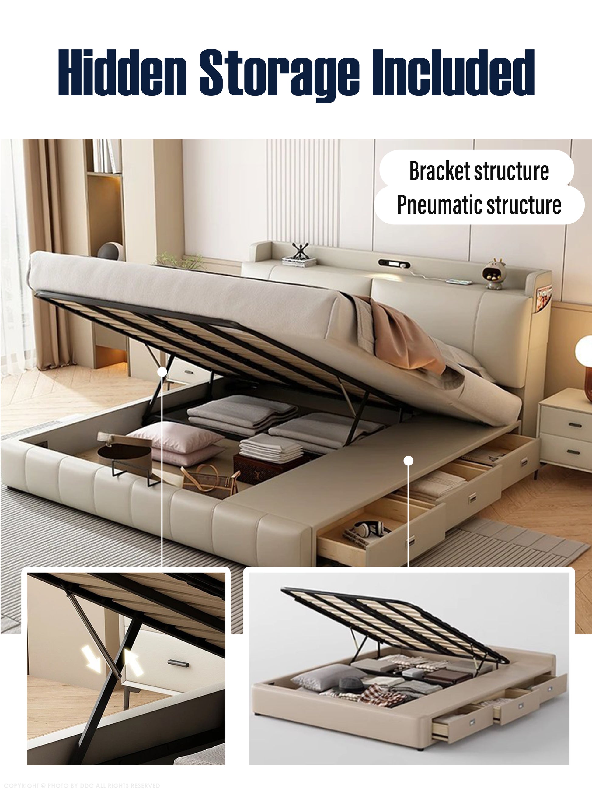 Our elegant upholstered bed with a cushioned headboard, built-in nightstands with shelves, and spacious under-bed storage drawers is the perfect addition to any stylish home.