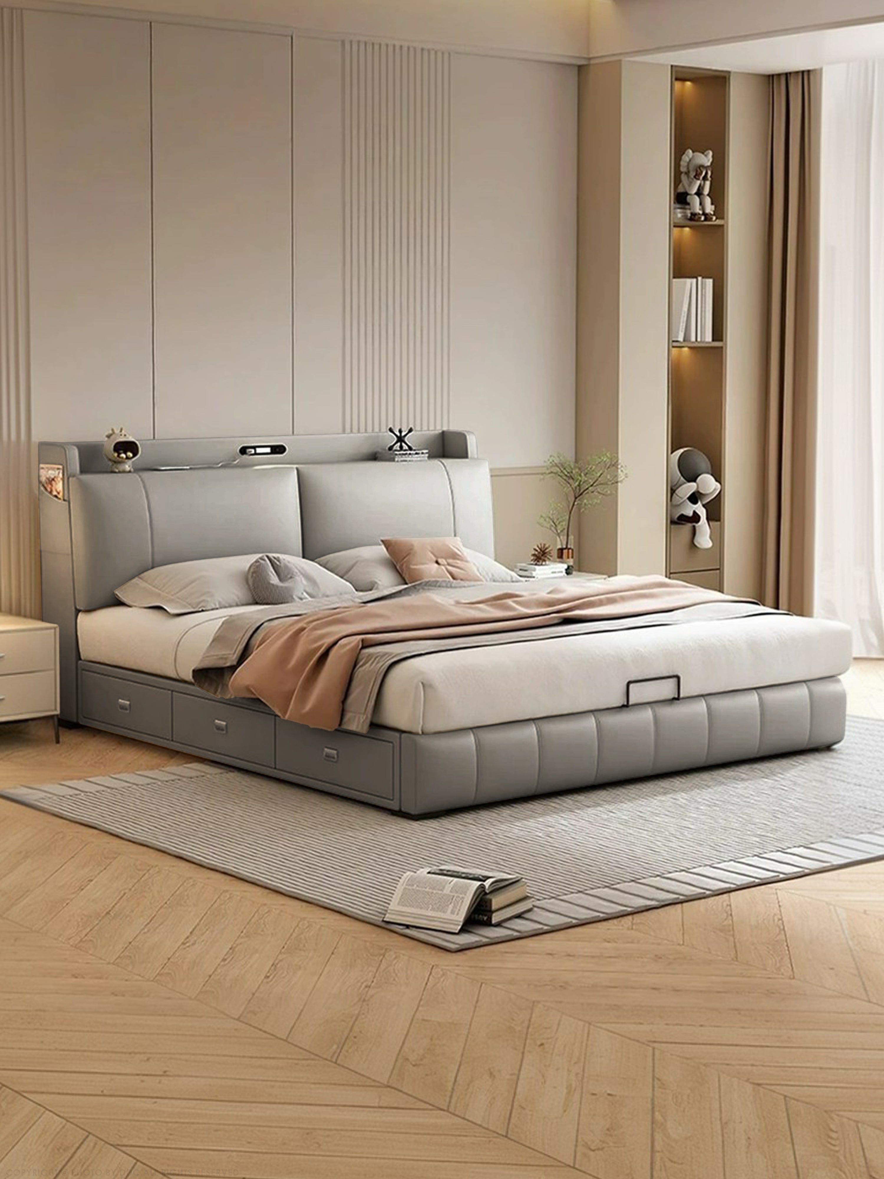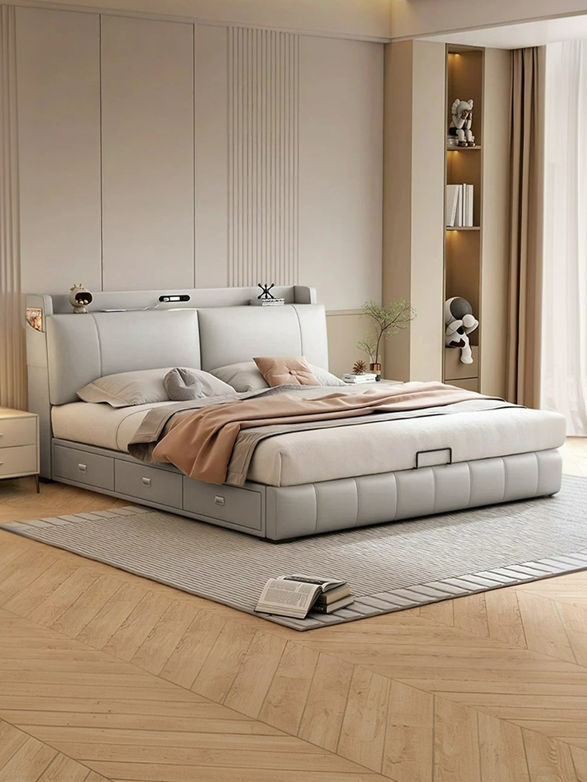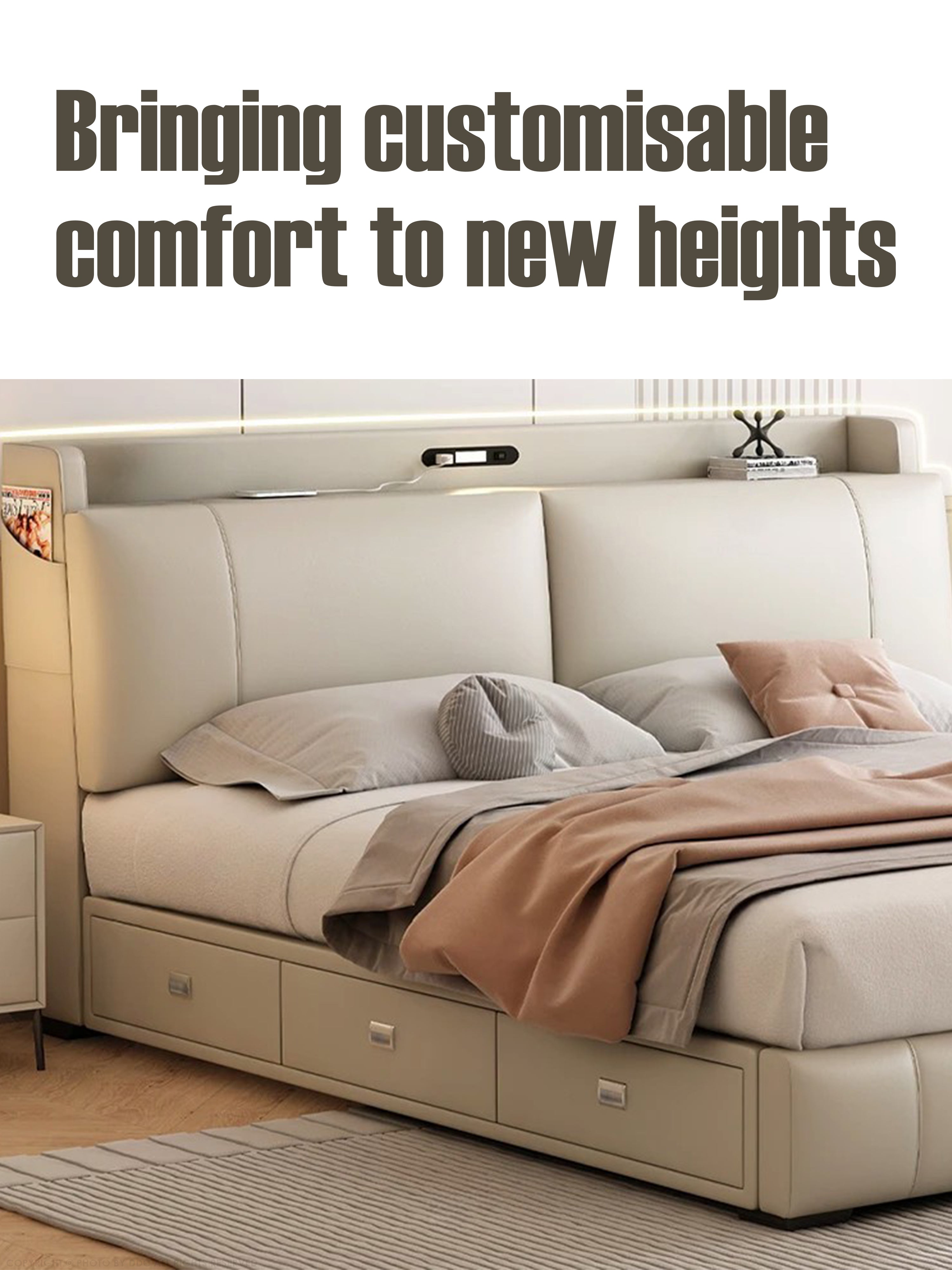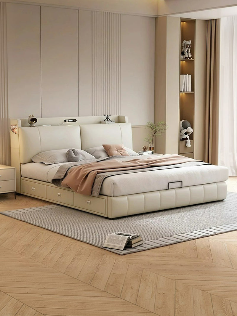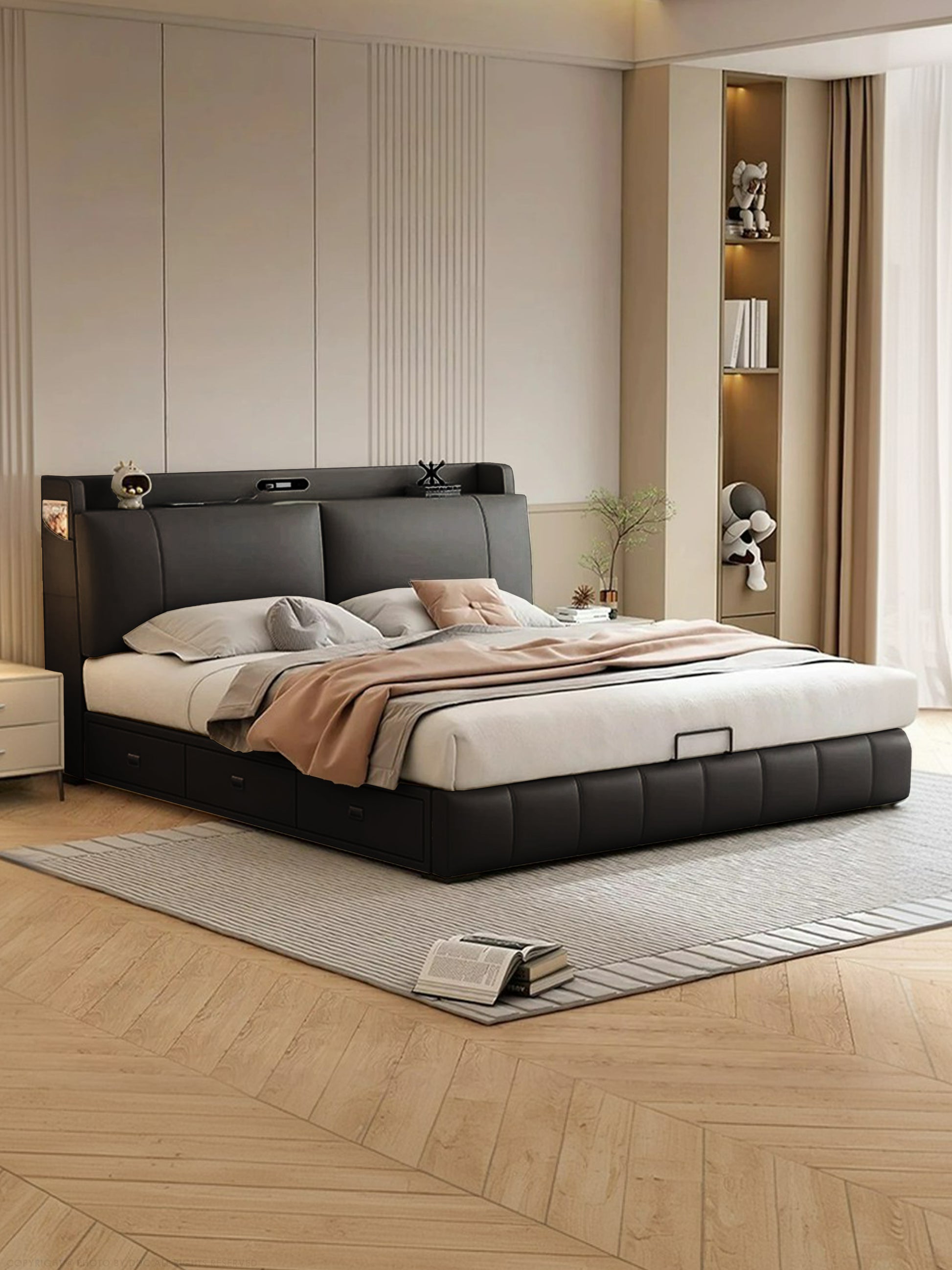 Our elegant upholstered bed with a cushioned headboard, built-in nightstands with shelves, and spacious under-bed storage drawers is the perfect addition to any stylish home.