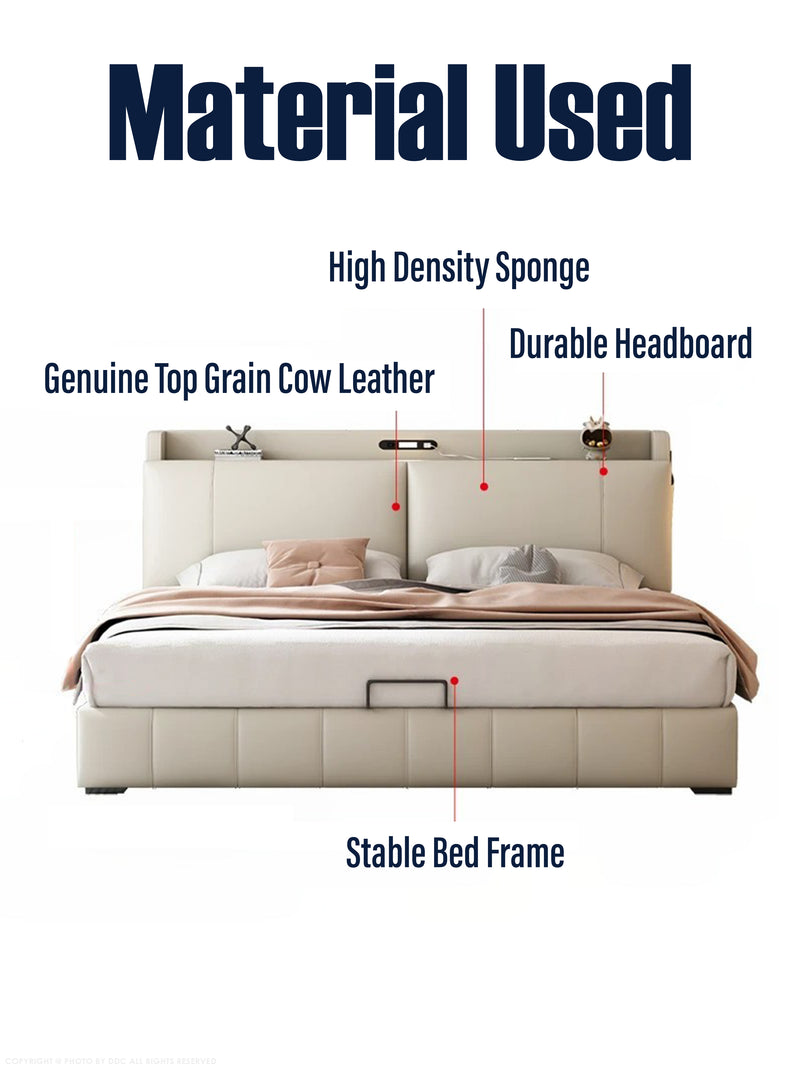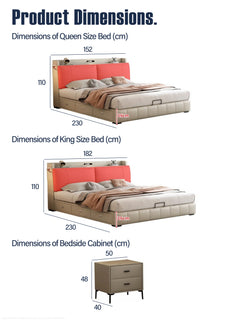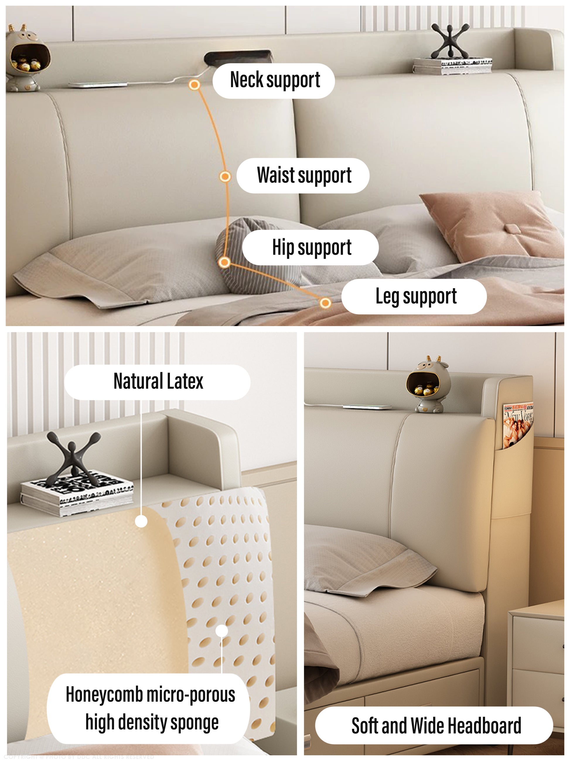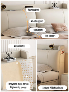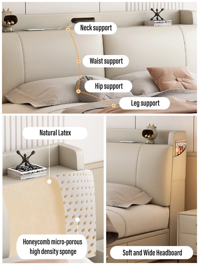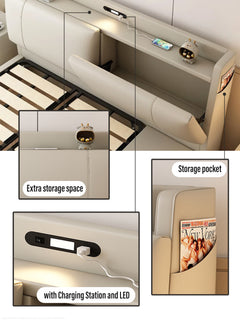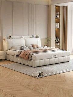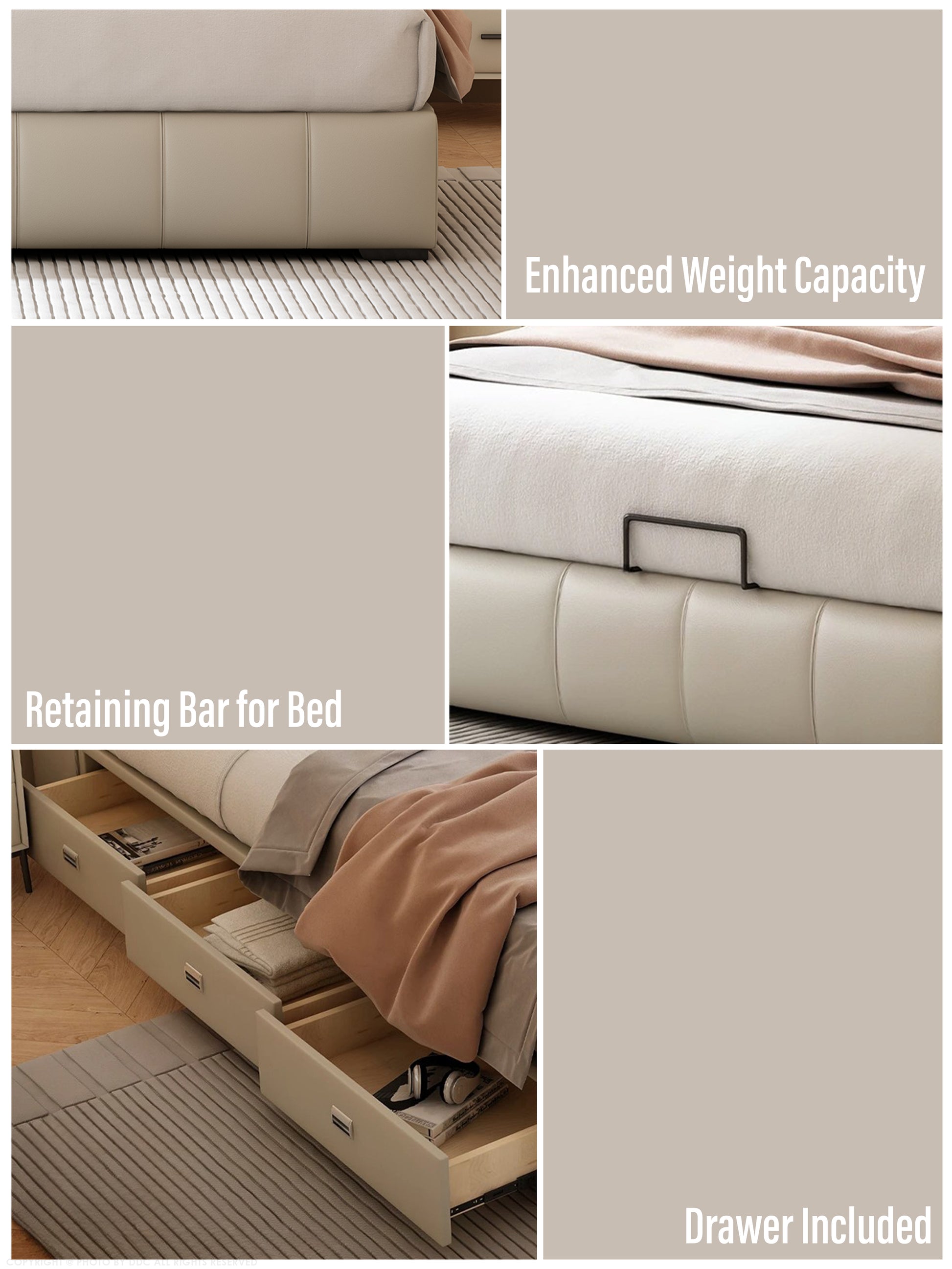 Our elegant upholstered bed with a cushioned headboard, built-in nightstands with shelves, and spacious under-bed storage drawers is the perfect addition to any stylish home.