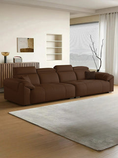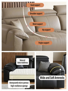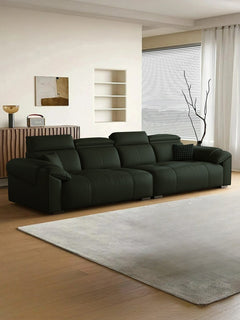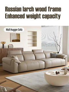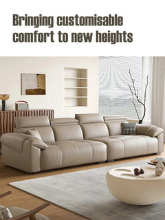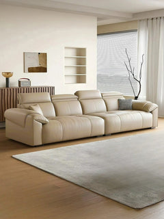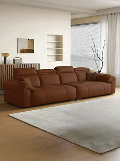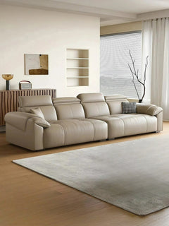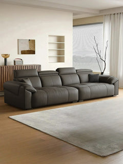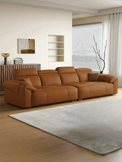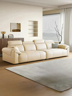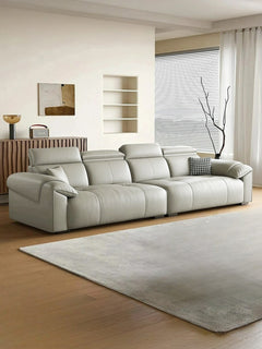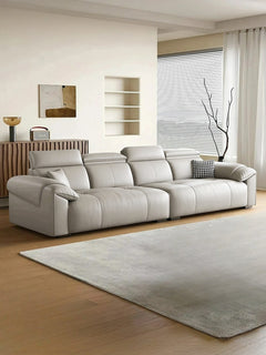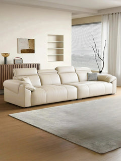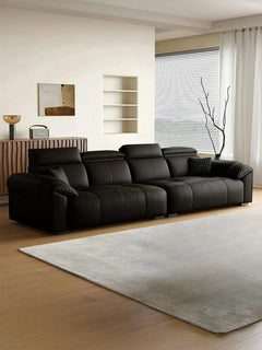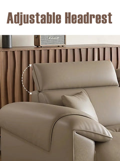 Indulge in Relaxation with the Adjustable Headrest Italian Minimalist Sofa. This modern sofa is upholstered in buttery-soft top-grain leather, inviting you to unwind in pure comfort. The unique elephant ear design of the armrests adds a touch of whimsy, while the adjustable headrest allows you to customize your comfort level for ultimate relaxation.