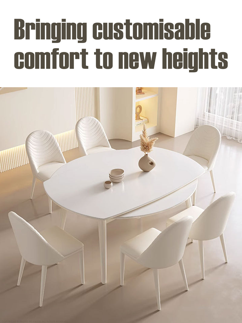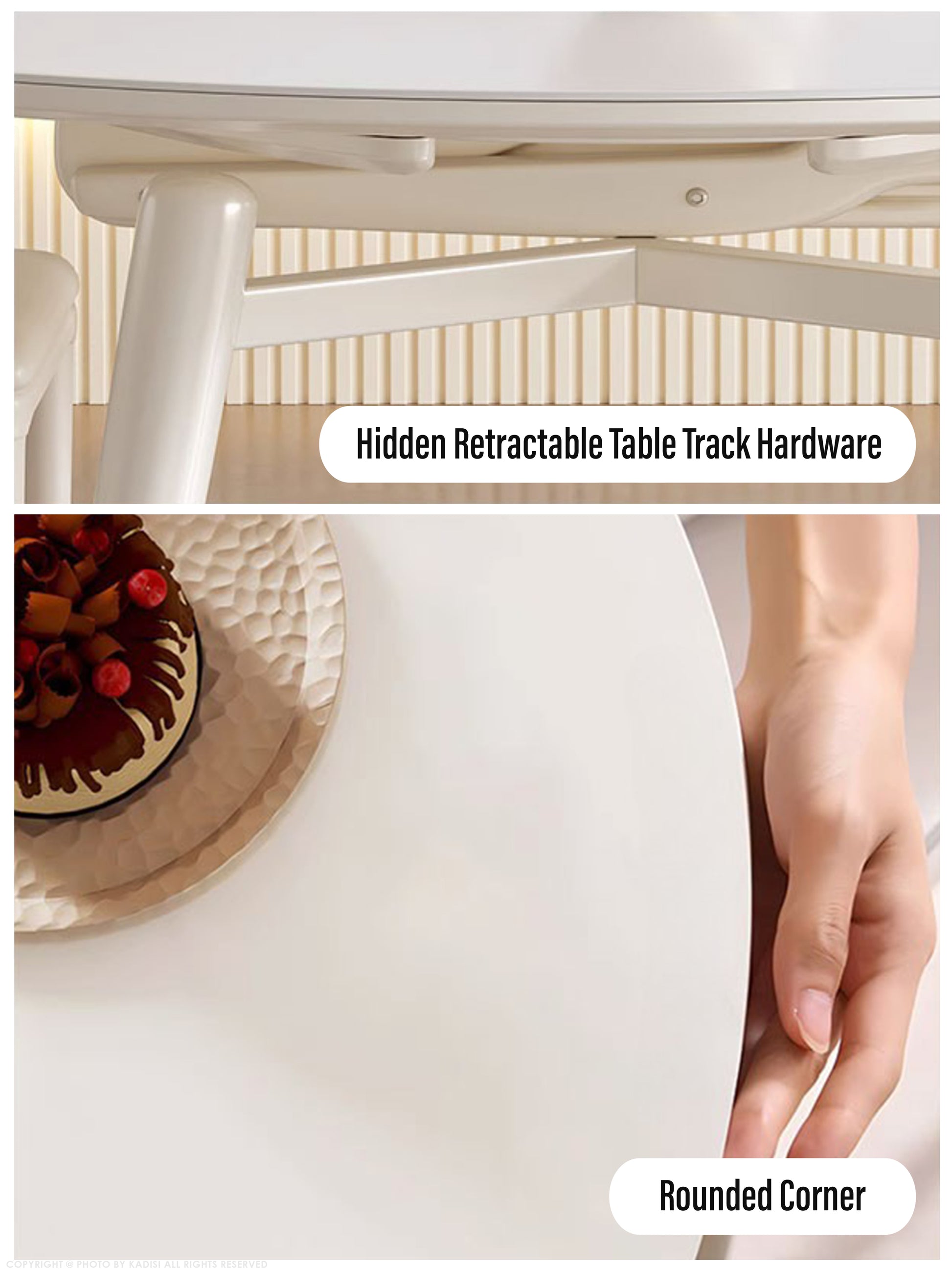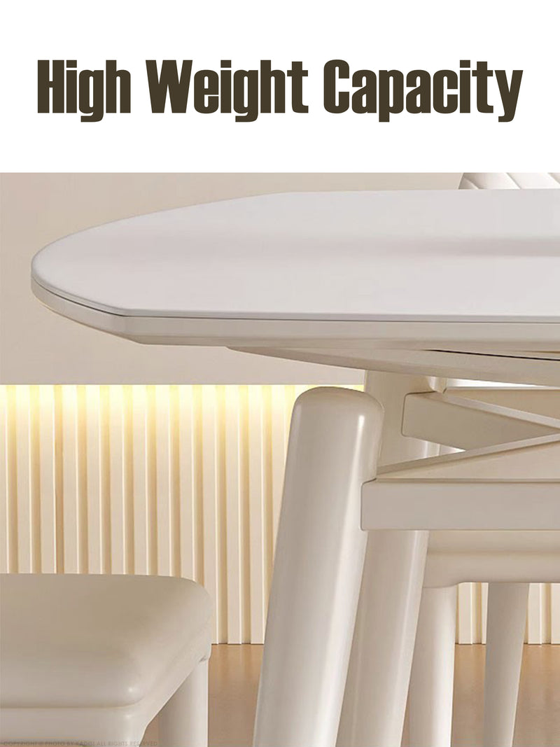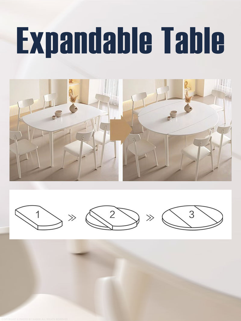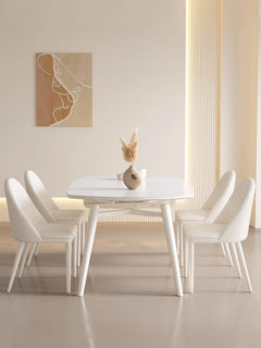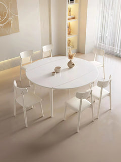 This modern dining set features a round extendable table and matching chairs, perfect for small spaces. The minimalist white design of the table and chairs adds a touch of sophistication.